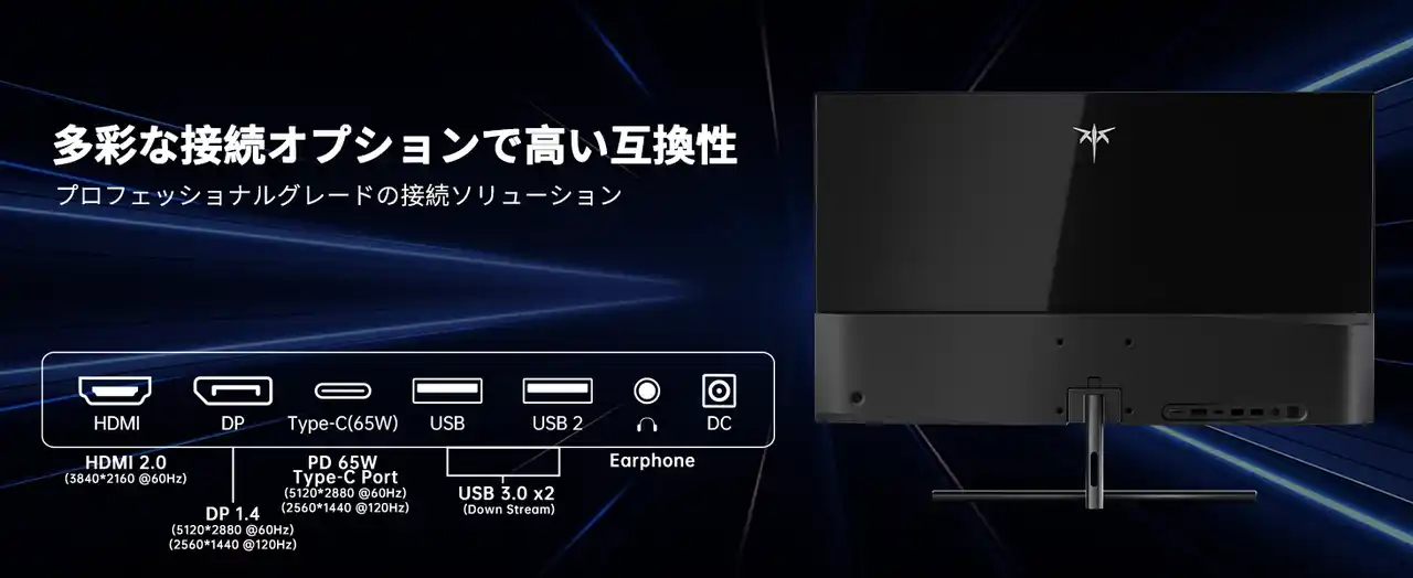 USB Type-C端子は、たった1本のケーブルで5K映像伝送とMacBookへの最大65W給電を同時に行う。煩雑な配線がなくなり、デスク周りが整理されるだけでなく、ノートPCのバッテリー切れの心配もない。HDMI 2.0、DisplayPort 1.4も装備し、ゲーム機など多様なデバイスとの接続性も確保している。 |