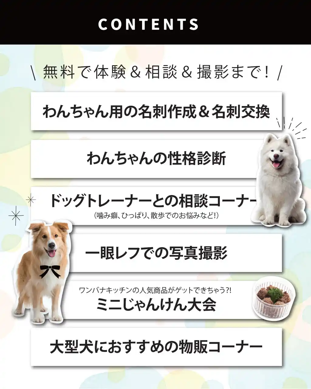 | 名刺交換や性格診断、トレーナー相談、撮影会など飼い主も愛犬も楽しめる充実コンテンツが盛りだくさん!笑顔と交流があふれるここでしか体験できない1日。 |