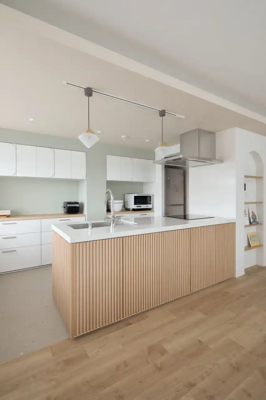 造作キッチンは、ルーバー扉で空間の主役に。ゴミ箱はシンク下に収納し、冷蔵庫はパントリーへ隠して生活感を抑えました。洗面は廊下に設け、オレンジのクロスや人造大理石の天板で、華やかさと重厚感を演出。真鍮の照明やアクセサリーでまとめ、キッチンのルーバーともデザインを揃えた統一感のある上質な空間です。 |