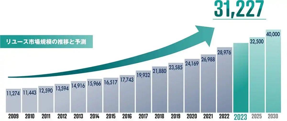 国内リユース市場規模は14年連続で拡大し3.1兆円規模。2030年には4兆円規模に拡大。出典:リユース経済新聞推計値 |