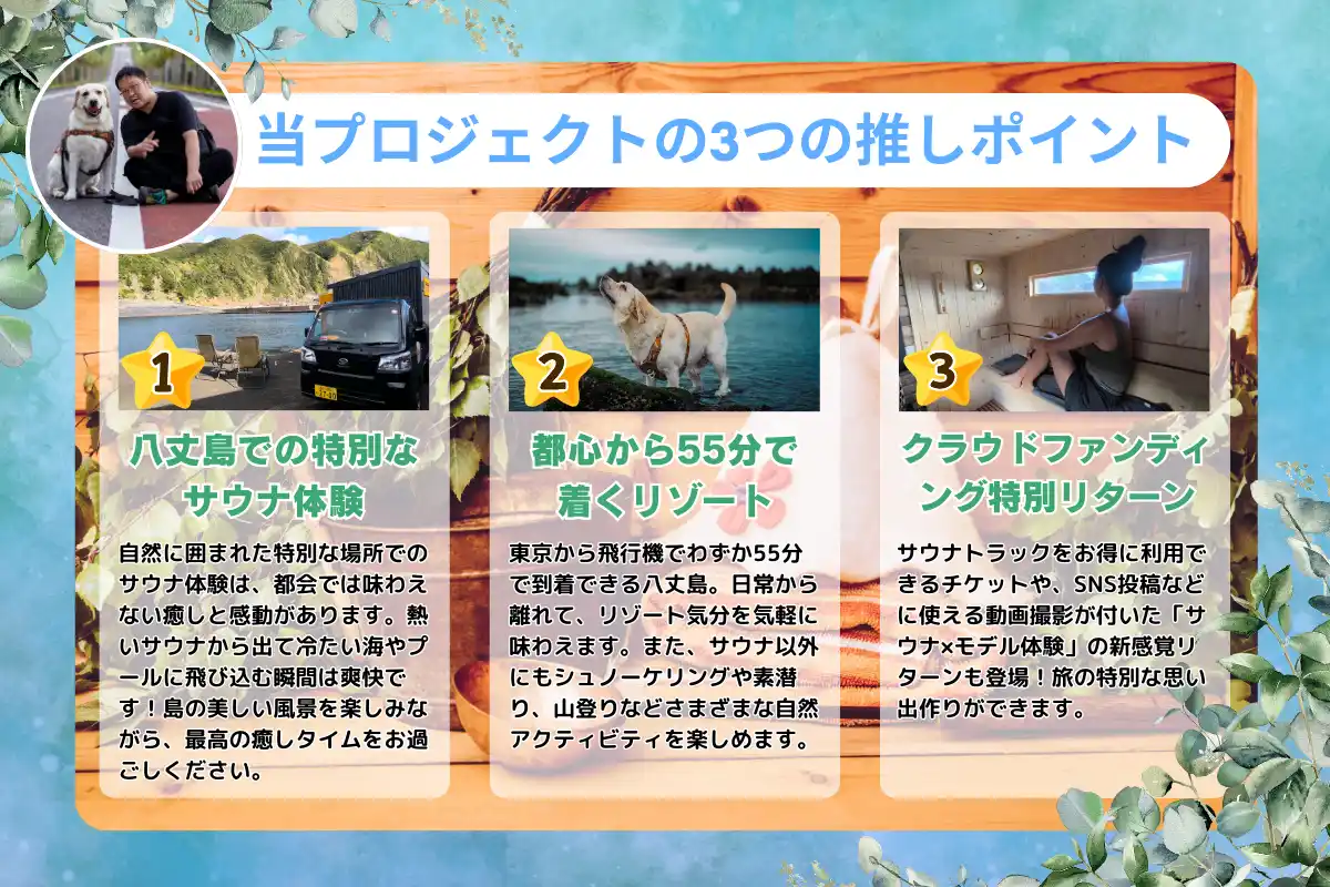 今回のクラウドファンディングでは、サウナトラックのお得な割引プランや、クラウドファンディング限定のオリジナルグッズをご用意しています。ご支援いただいた資金は、八丈島の魅力を発信・宣伝するための広告費に充当させていただきます。 |