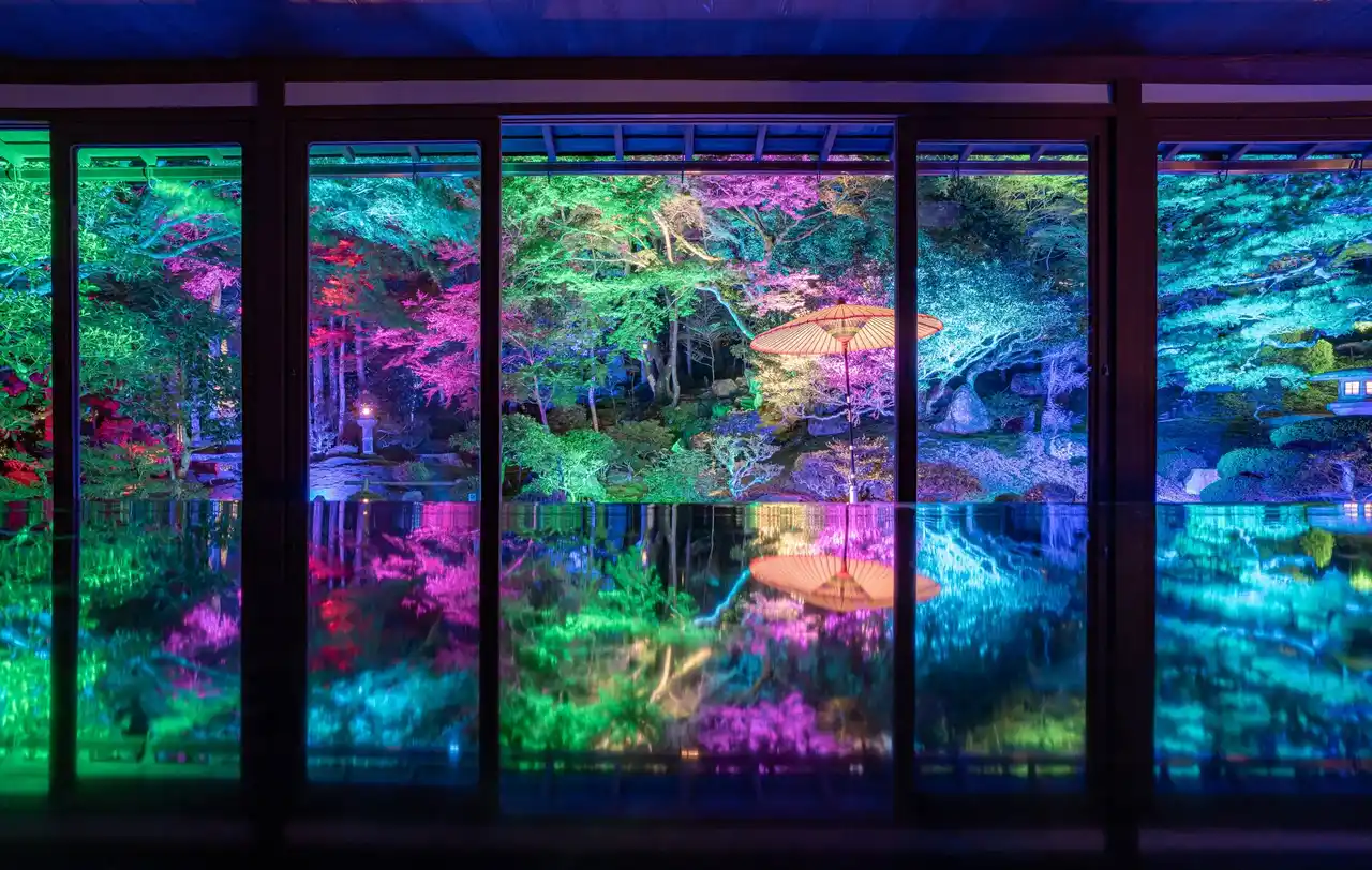 国の名勝庭園に指定されている1,000坪の庭園が色彩豊かに照らされる「旧竹林院 夏のライトアップ」を今年も開催中!幻想的な雰囲気が漂う中、主屋の座卓に反射した庭園のライトアップ撮影をお楽しみいただけます。また、今年は「怪談ナイト」や「貸切プラン」など、特別企画も充実しています。 |