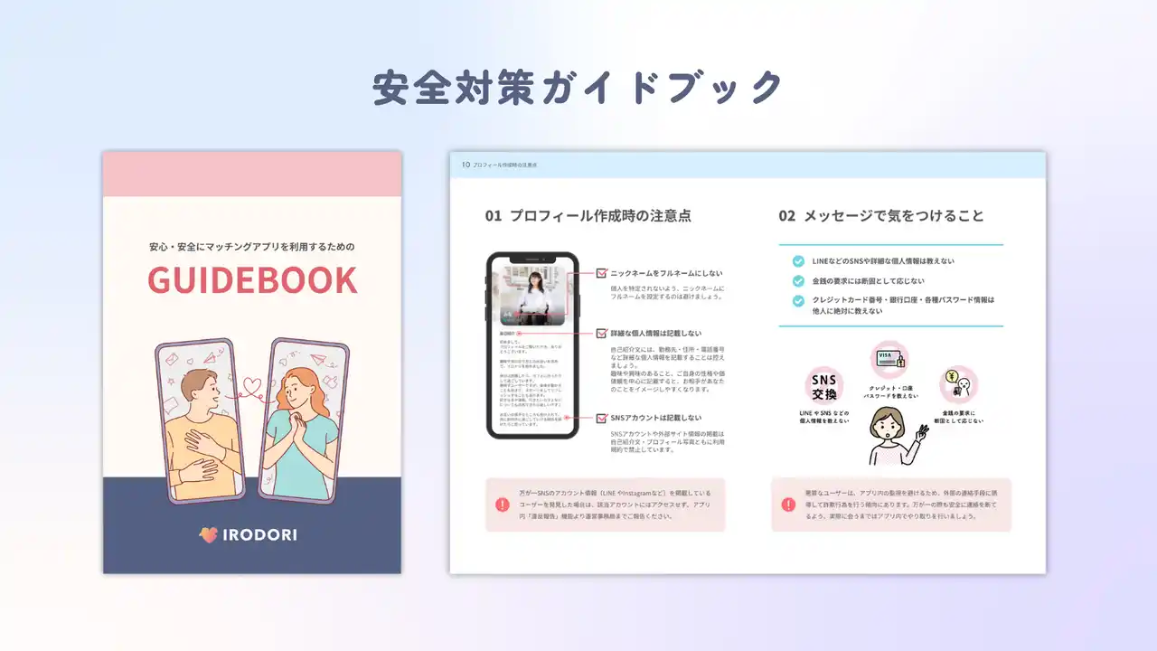 近年、マッチングアプリを悪用した詐欺やトラブルが社会問題となっています。 イロドリは、これらを未然に防ぐため、不正ユーザーの排除に加え、会員の皆さまが安心・安全にアプリをご利用いただけるよう、「安全対策ガイドブック」を無料で公開しました。 |