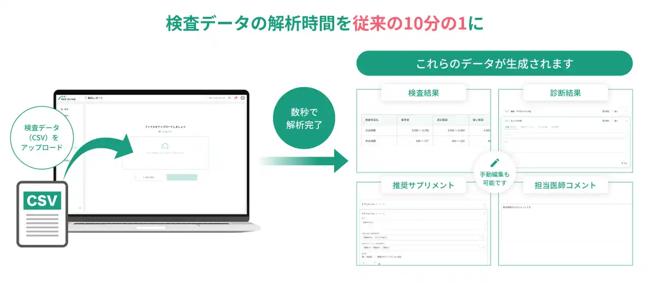 株式会社グリーンメチル(本社:埼玉県さいたま市、代表取締役:小林良太)は、SaaS型診療支援プラットフォーム「メディテックハブ」に搭載した特許取得済み(特許第7457420号)※の血液栄養解析ロジックによるレポート自動生成の累計件数が1,000件を突破したことをお知らせします。 |