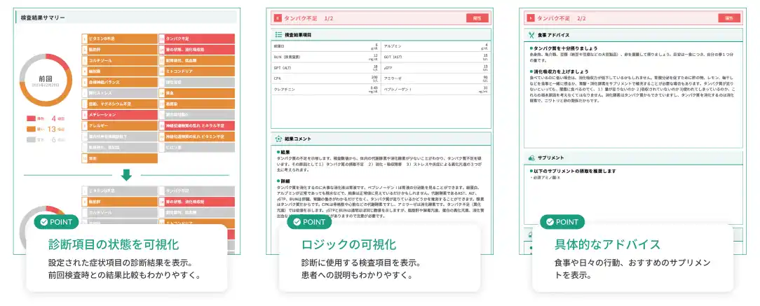 特に、これから栄養療法を始めるクリニックでも、専門人材や高度な知識がなくても質の高い診療を効率的に導入でき、既に栄養療法を行っているクリニックにとっては、診療精度や継続率をさらに高める強力なサポートとなります。 |
