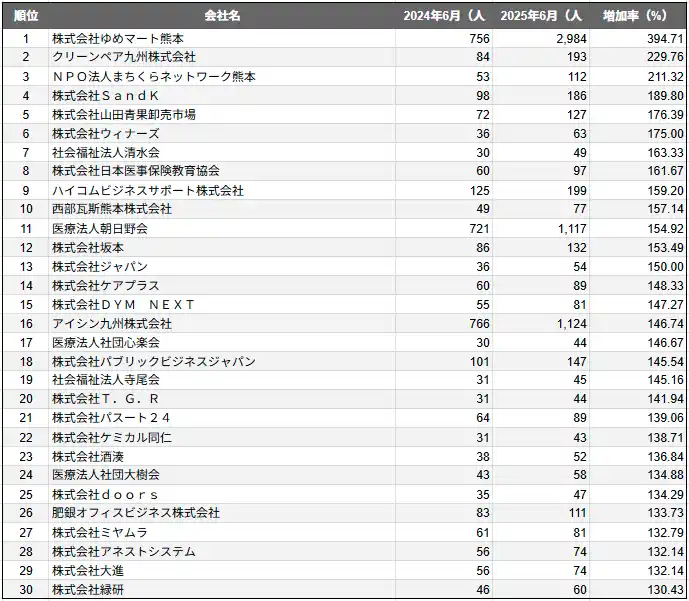 株式会社SalesNow(本社:東京都渋谷区、代表取締役:村岡功規、以下「当社」)は、国内540万社の企業情報を完全網羅した日本最大級のデータベース「SalesNow DB」より、人口の多い上位30都市を対象とした「従業員数増加率ランキング」を発表しました。本リリースでは、各都市別のデータをもとに、今回は「熊本市に本社を置く企業」を対象に、従業員数の増加傾向にフォーカスします。