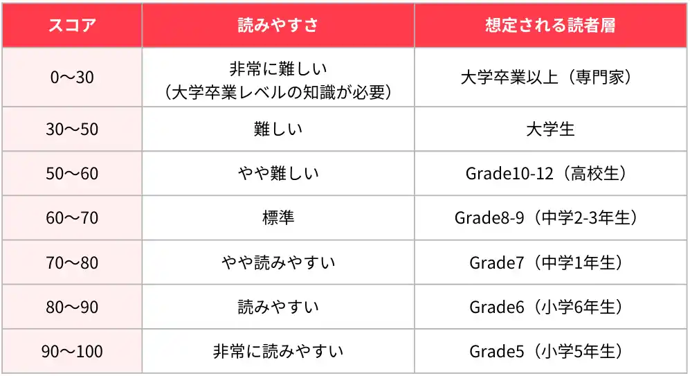 (*5) FRE(Flesch Reading Ease Formula)スコアとは、英文の「読みやすさ」を測定するための指標です。文章の平均文長(1文あたりの単語数)と平均音節数(1単語あたりの音節数)を使って、0から100のスコアを算出します。 |