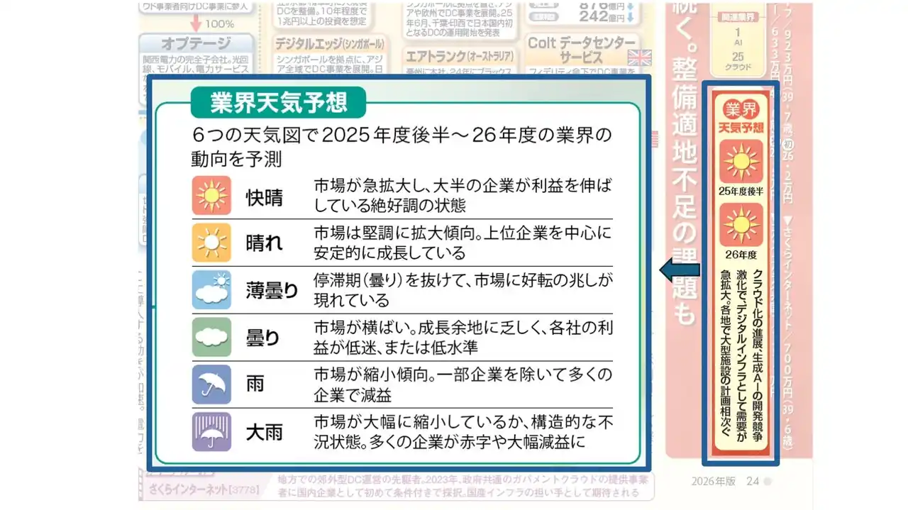ポイント2.見逃せない新企画 各業界の主要企業1000社超の時価総額と、株価騰落率、配当利回りを掲載。10年間の天気予想も従来の2倍超の約60業界を掲載したほか、業界再編史は20以上を収録し、業界の今とこれからが一目でわかります! |
