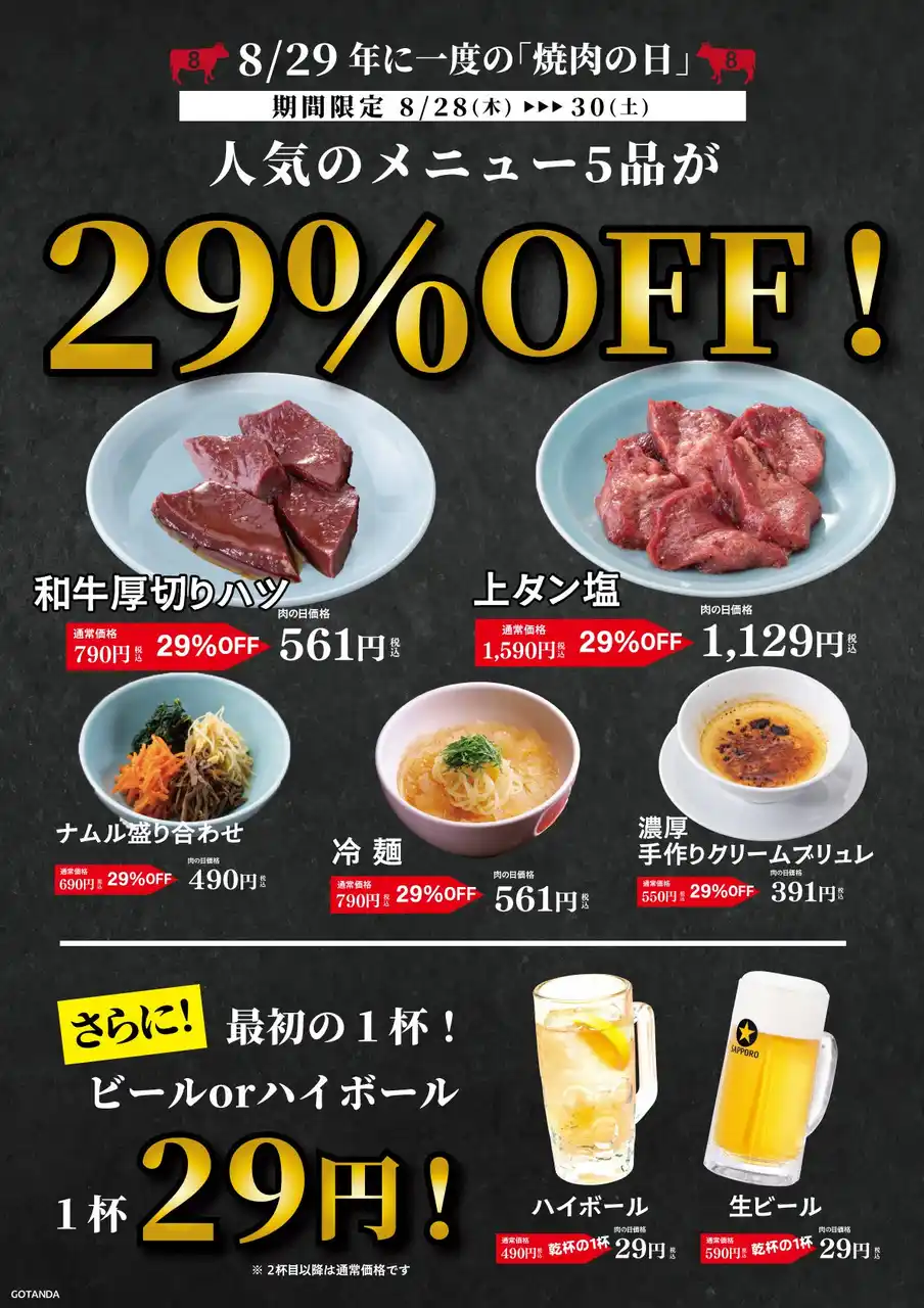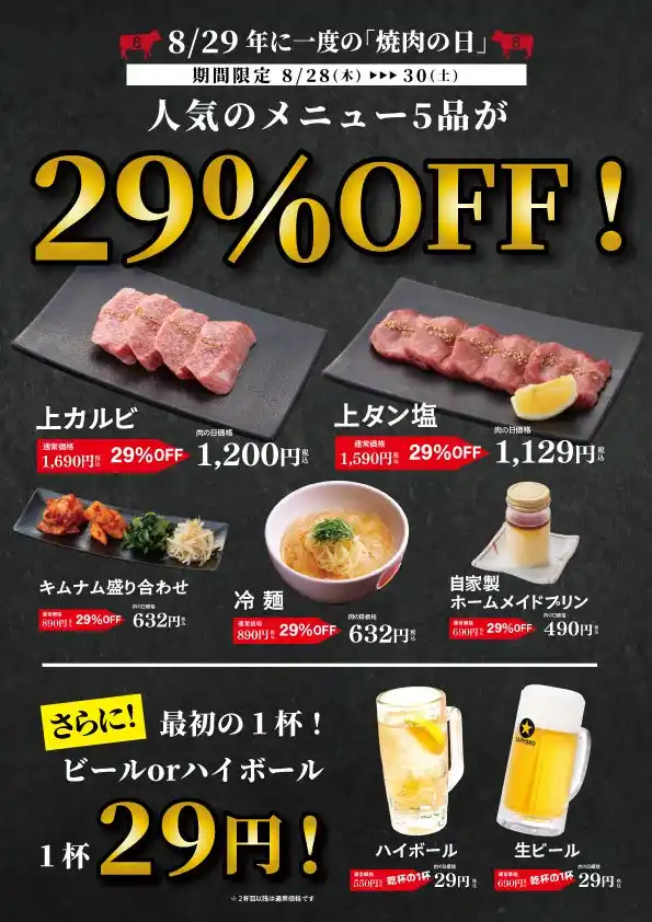8月29日の"焼肉の日"にちなみ、人気メニュー「上カルビ」や「上タン塩」を含む厳選5品を29%OFFでご提供。さらに、最初の一杯(生ビールもしくはハイボール)が29円(税込)と破格のお値段でお楽しみいただけます。 |