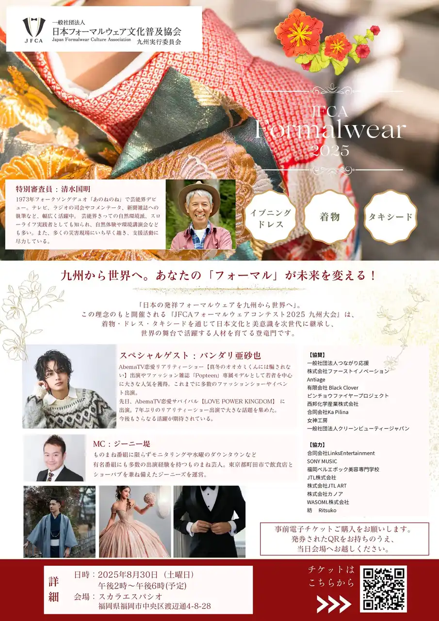 | 東京都中央区のIT企業『株式会社ファーストイノベーション』(本社:東京都中央区晴海3-13-1 DEUX TOURS EASTタワー52F、代表取締役社長:木ノ根雄志、以下ファーストイノベーション)は、官民連携の地方創生団体『一般社団法人つながり応援』(理事長:清水国明、副理事長:木ノ根雄志・梶川隆史)が展開する『つながり応援プロジェクト』の一環として、2025年8月30日(土)に福岡市で初開催される『JFCAフォーマルウェアコンテスト2025 九州大会』を協賛しております。 | |||