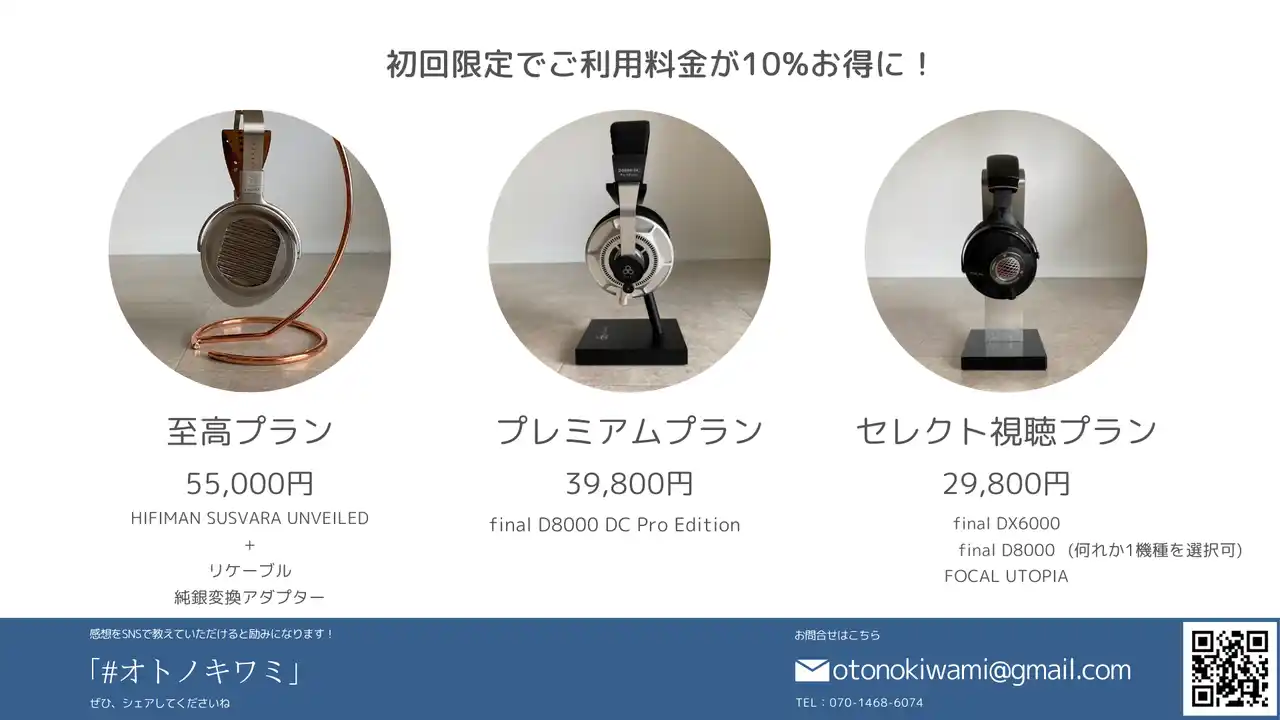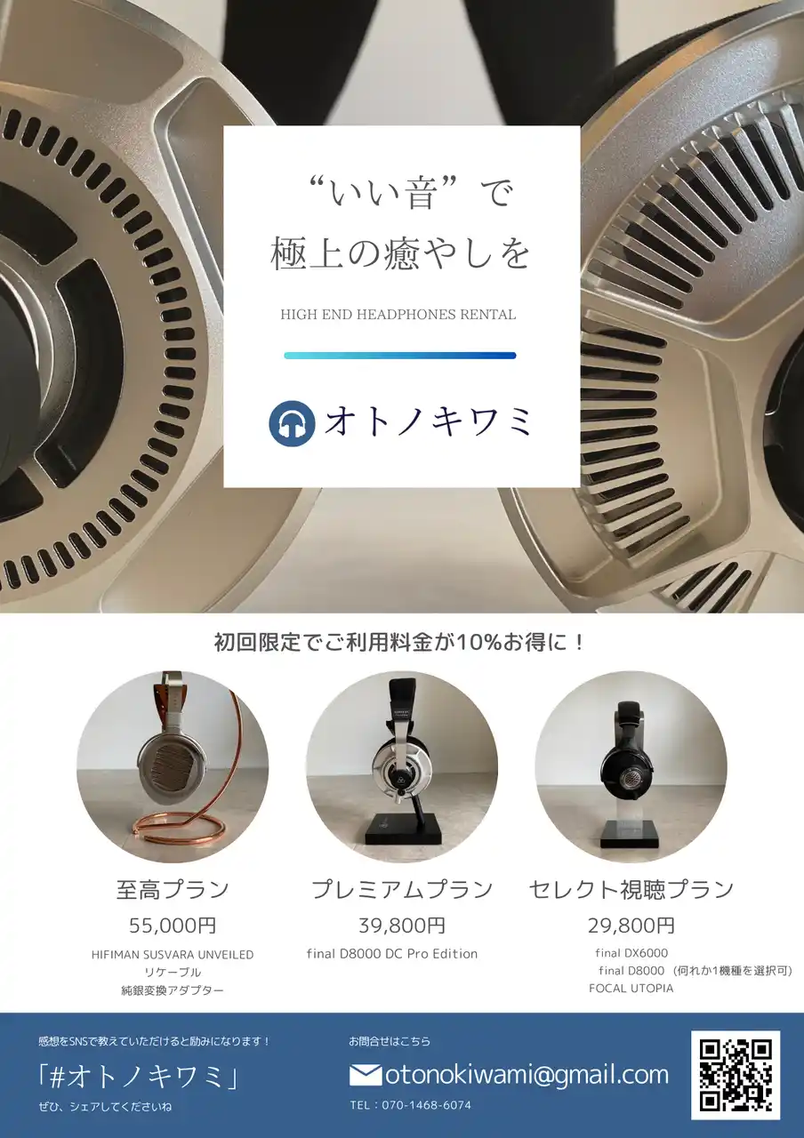 現在は FOCAL UTOPIA(初代)、final D8000シリーズ、final DX6000、HiFiMAN SUSVARA UNVEILED などの実機を所有し、自ら検証を続け、その魅力をレンタルサービスとして届けています。 |