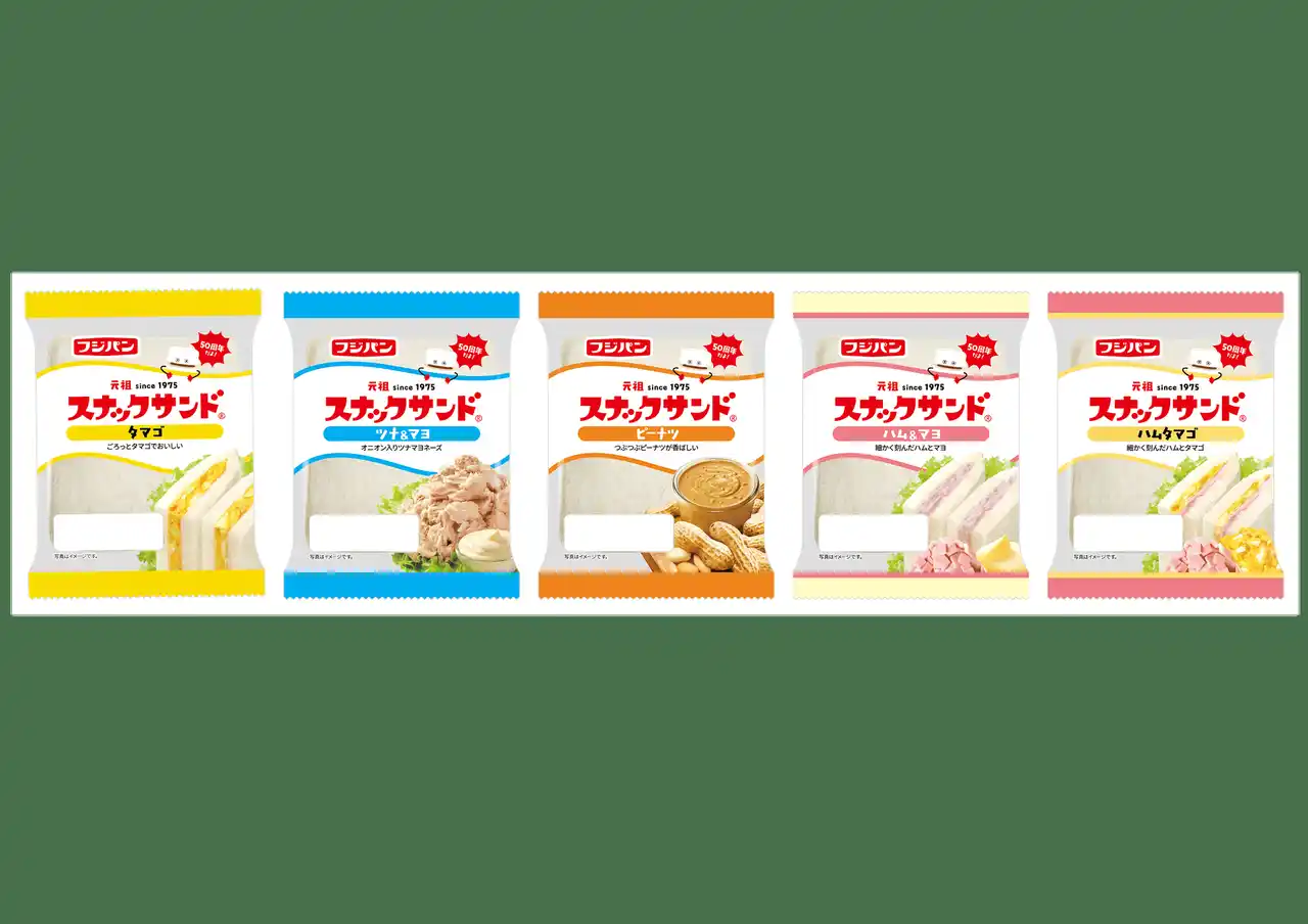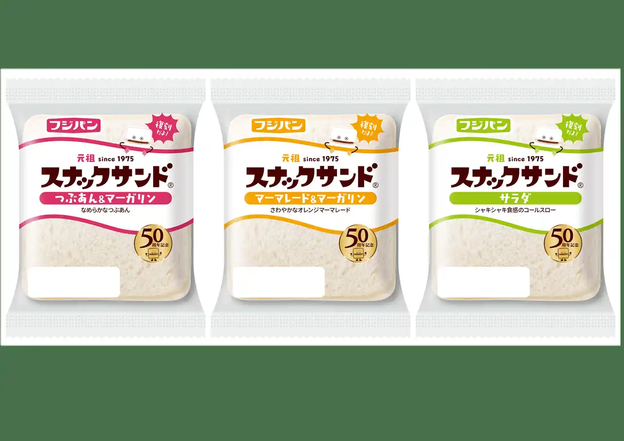 フジパン株式会社(愛知県名古屋市)で発売している日本初の携帯サンドイッチの『スナックサンド』が、2025年9月15日で発売50周年を迎えます。50周年を記念し、9月1日(月)より、スナックサンド全品のパッケージがリニューアルします。また、同日より発売初期のスナックサンドの味わいを復刻し、現代の味わいにアレンジした商品と、中のフィリングが増量した『スナックサンド こだわりビーフカレー』を期間限定で発売いたします。50周年を迎えるスナックサンドに乞うご期待ください。 |