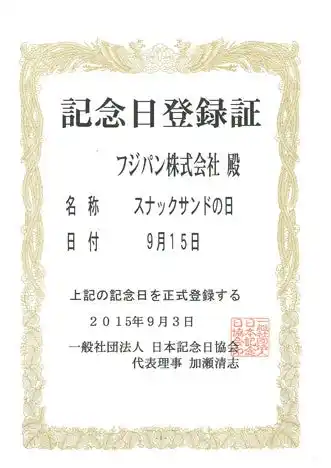 2015年には発売40周年を記念して、一般社団法人日本記念日協会が登録する記念日として、発売日にあたる9月15日を「スナックサンドの日」として認定。(2015年9月3日登録)また、2016年には、スナックサンドのキャラクター「はさみちゃん」「んーぱ」を登場させるなど、スナックサンドの魅力を発信し続けています。 |