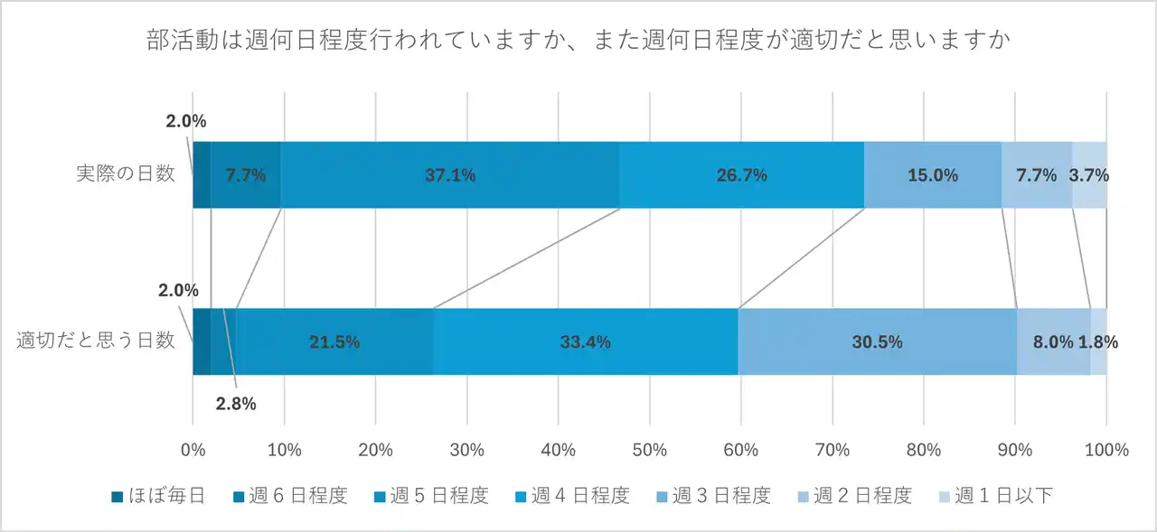 実際の活動日数をみると、最も多いのは「週5日程度」で37.1%、次いで「週4日程度」で26.7%と、あわせて全体の6割以上にのぼった。適切だと思う活動日数は、「週4日程度」が33.4%、「週3日程度」が30.5%と、実際の活動日数よりも少ない日数が適切だと考えている傾向があることがわかった。 |