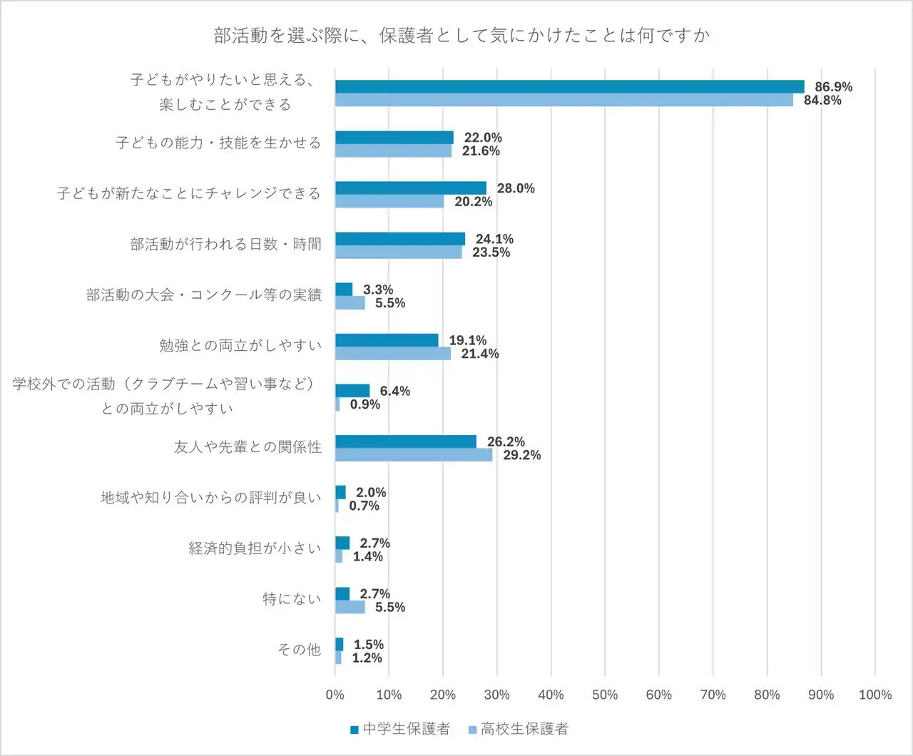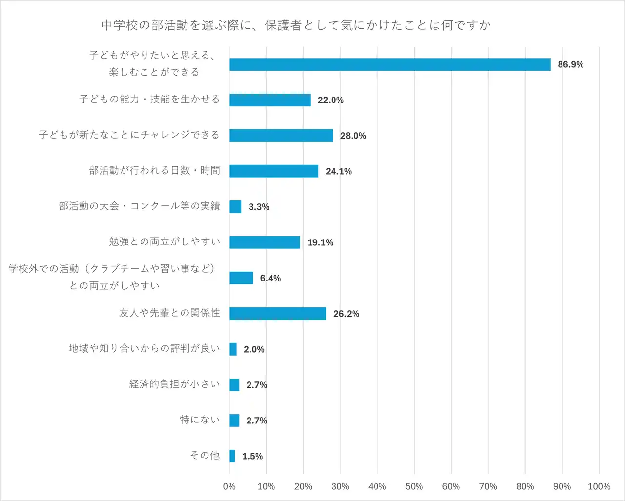 子どもが部活動を選ぶ際に、保護者として気にかけたことを聞いた。最も多かったのは「子どもがやりたいと思える、楽しむことができる」で86.9%にのぼった。次いで「子どもが新たなことにチャレンジできる」が28.0%、「友人や先輩との関係性」が26.2%だった。 |