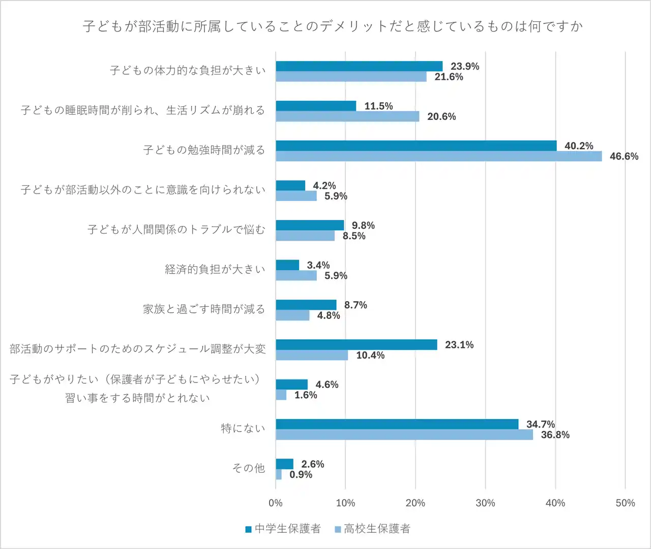 中学生保護者と高校生保護者のどちらも最も回答が多かったのは「子どもの勉強時間が減る」だった。最も割合に差が出たのは「部活動のサポートのためのスケジュール調整が大変」で、10ポイント以上の違いが見られた。中学生から部活動が始まり、小学生の時とはスケジュールが一変することや、高校生になると保護者のサポートをあまり必要としないことなどが影響していると思われる。一方で、どちらも4割弱の保護者が「特にない」と回答しており、デメリットを感じていない保護者も少なくないと考えられる。 |
