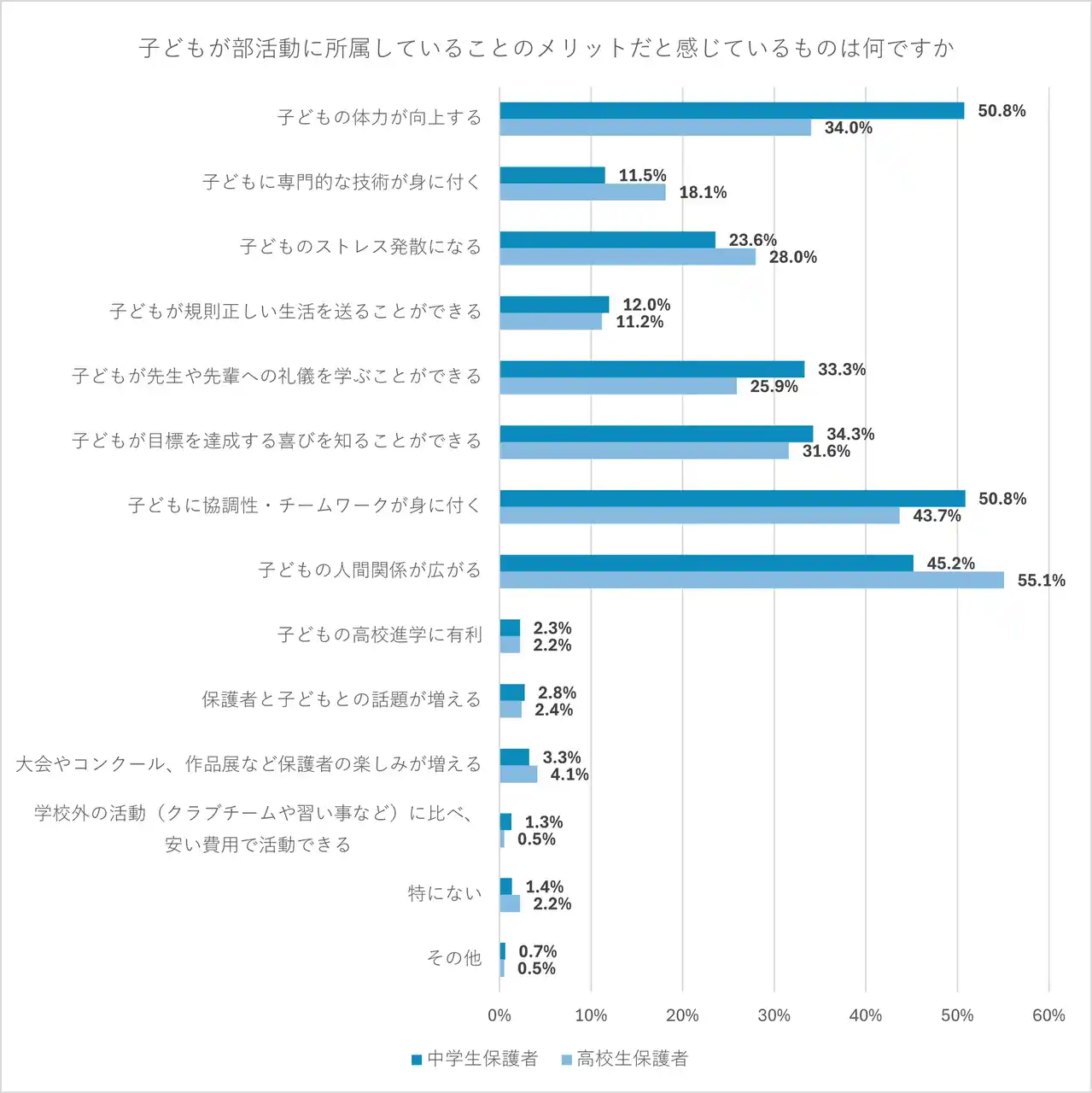 中学生保護者は高校生保護者よりも、特に「子どもの体力が向上する」点でのメリットを強く感じていることが分かった。高校生保護者は「子どもの人間関係が広がる」という点でメリットを感じているようだ。 |