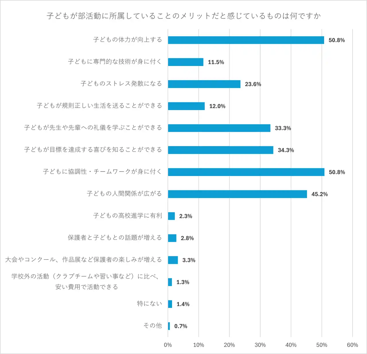 「子どもの体力が向上する」「子どもに協調性・チームワークが身に付く」が最も多く50.8%、次いで「子どもの人間関係が広がる」が45.2%だった。また、「子どもが目標を達成する喜びを知ることができる」「子どもが先生や先輩への礼儀を学ぶことができる」も、3分の1の保護者が、部活動に所属していることのメリットだと回答した。 |