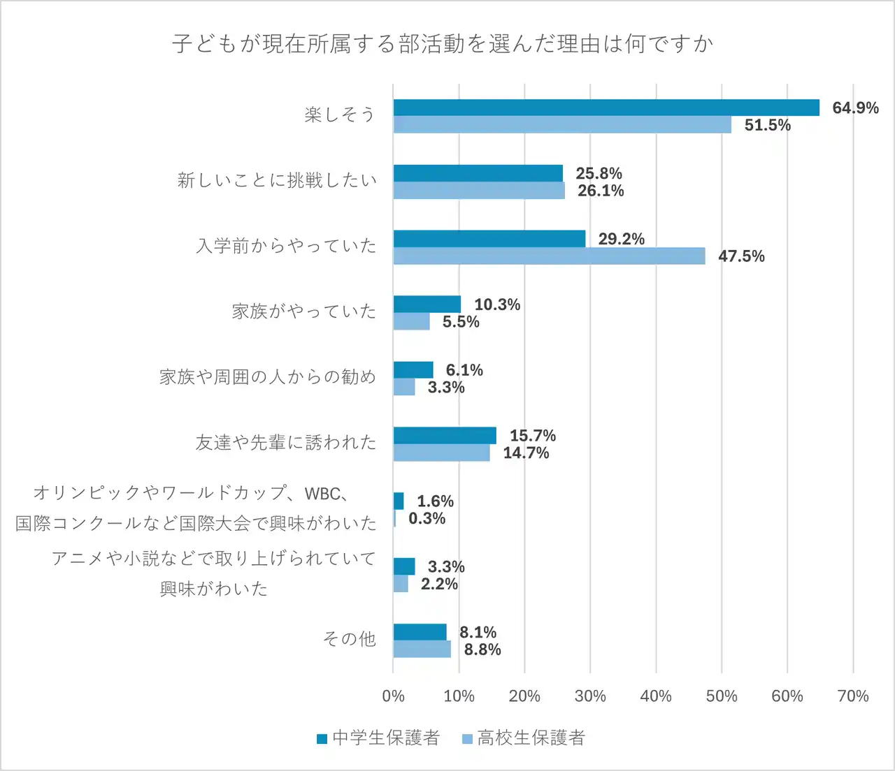 中学生保護者と高校生保護者のどちらも「楽しそう」が最も回答が多かった。また、高校生保護者は「入学前からやっていた」が多く、高校入学後も中学校で所属していた部活動を選ぶことが多いためと考えられる。 |