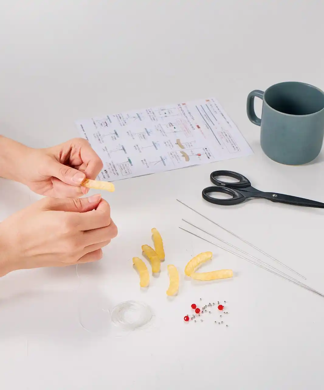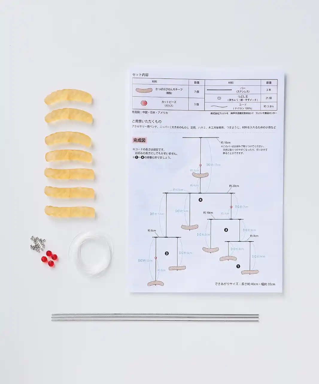 お届けキットには、かっぱえびせんパーツやガラスビーズなどの材料のほかに、作り方レシピも付いているので、初めてでも安心して作れます。 |