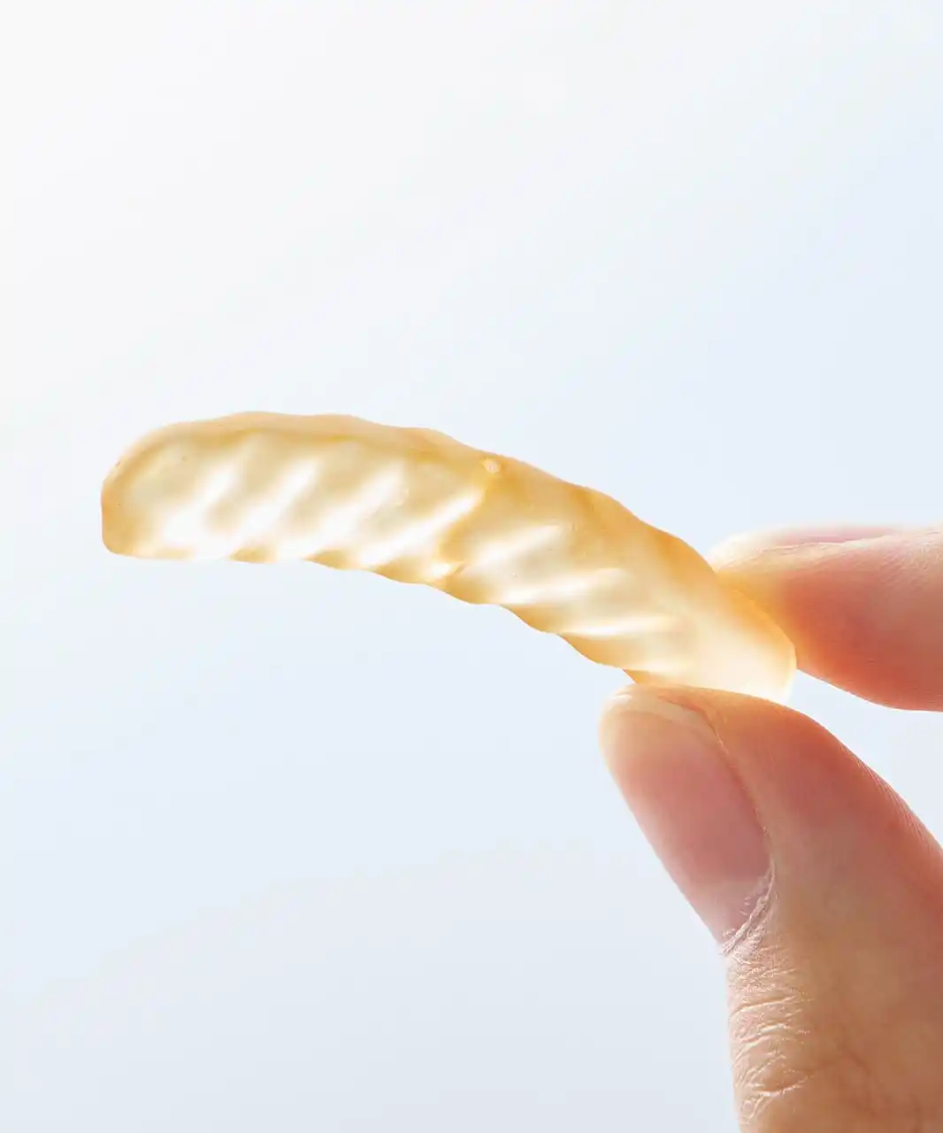本物のかっぱえびせんの形状に、半透明なマット加工がほどこされていて、インテリアにもなじむように仕上げられています。おいしそうなかっぱえびせんなのに、光に透けた感じがどこかおしゃれな雰囲気です。 |