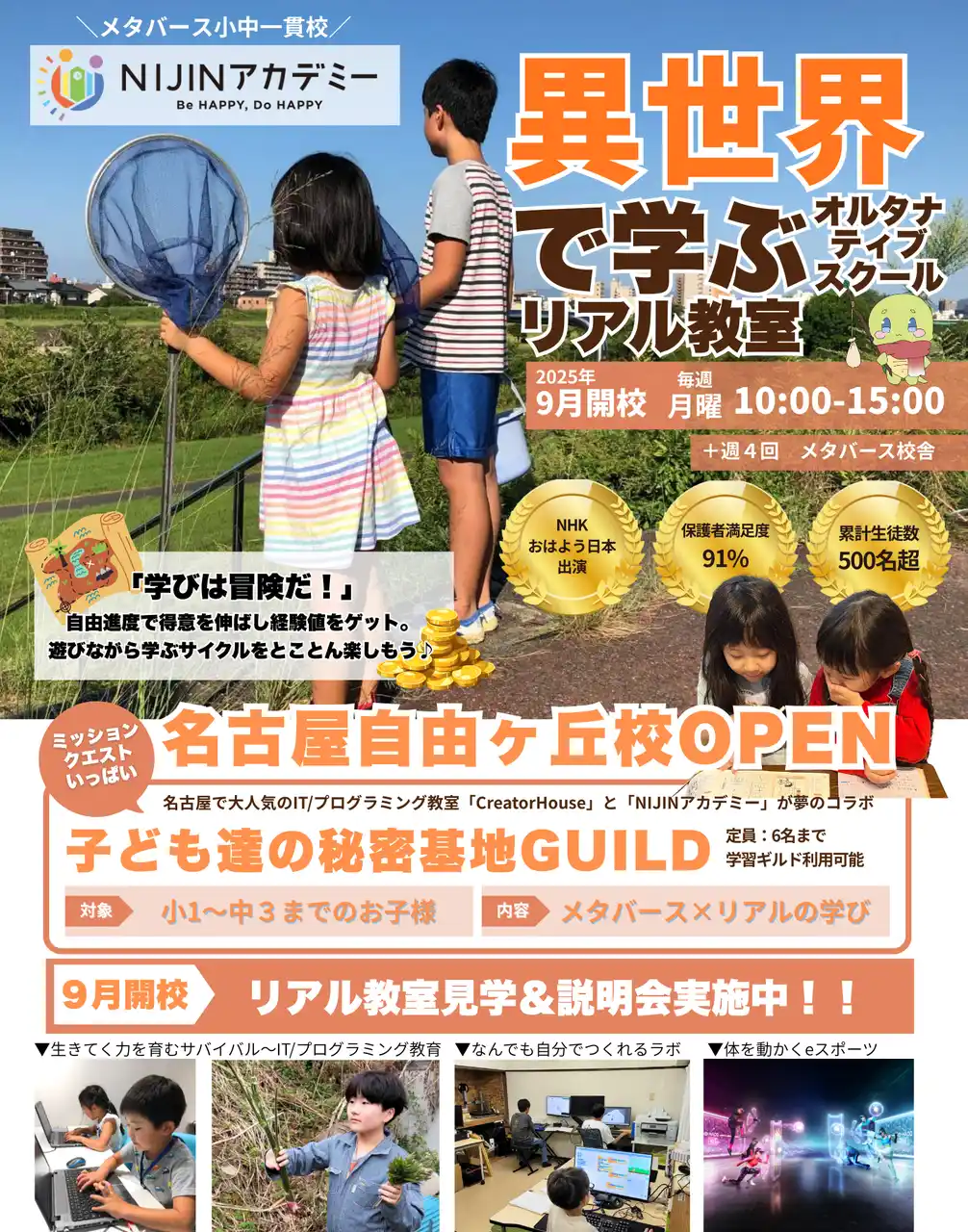 株式会社NIJIN(本社:東京都江東区、代表取締役:星野達郎)が運営する、不登校オルタナティブスクール『NIJINアカデミー』は、愛知県名古屋市千種区にリアル教室『NIJINアカデミー名古屋自由ヶ丘校』を2025年9月1日(月)に新規開校いたします。 |