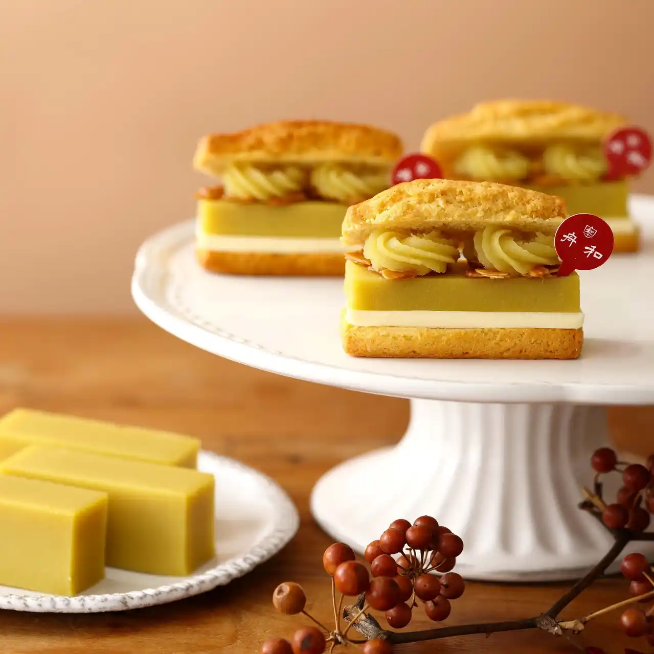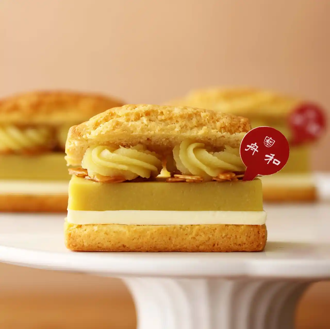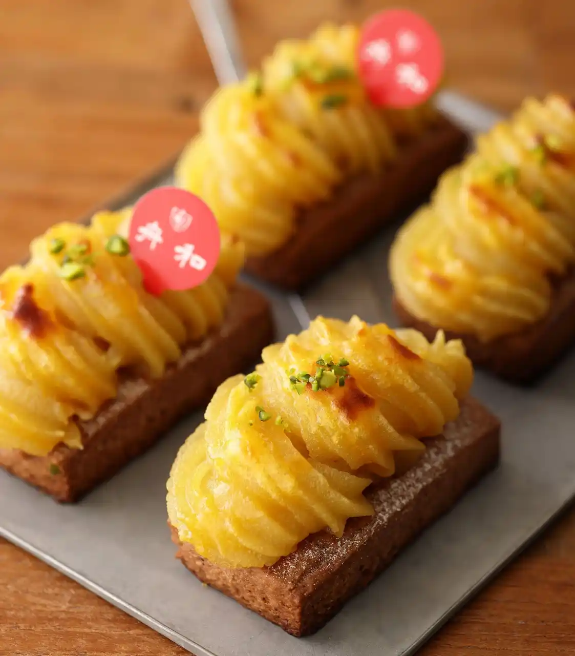 | 舟和の芋ようかんとさつまいもペーストを使用し、爽やかな酸味とコクが特徴の発酵バターと合わせ、アーモンドチュイールをサンドしました。 | |||