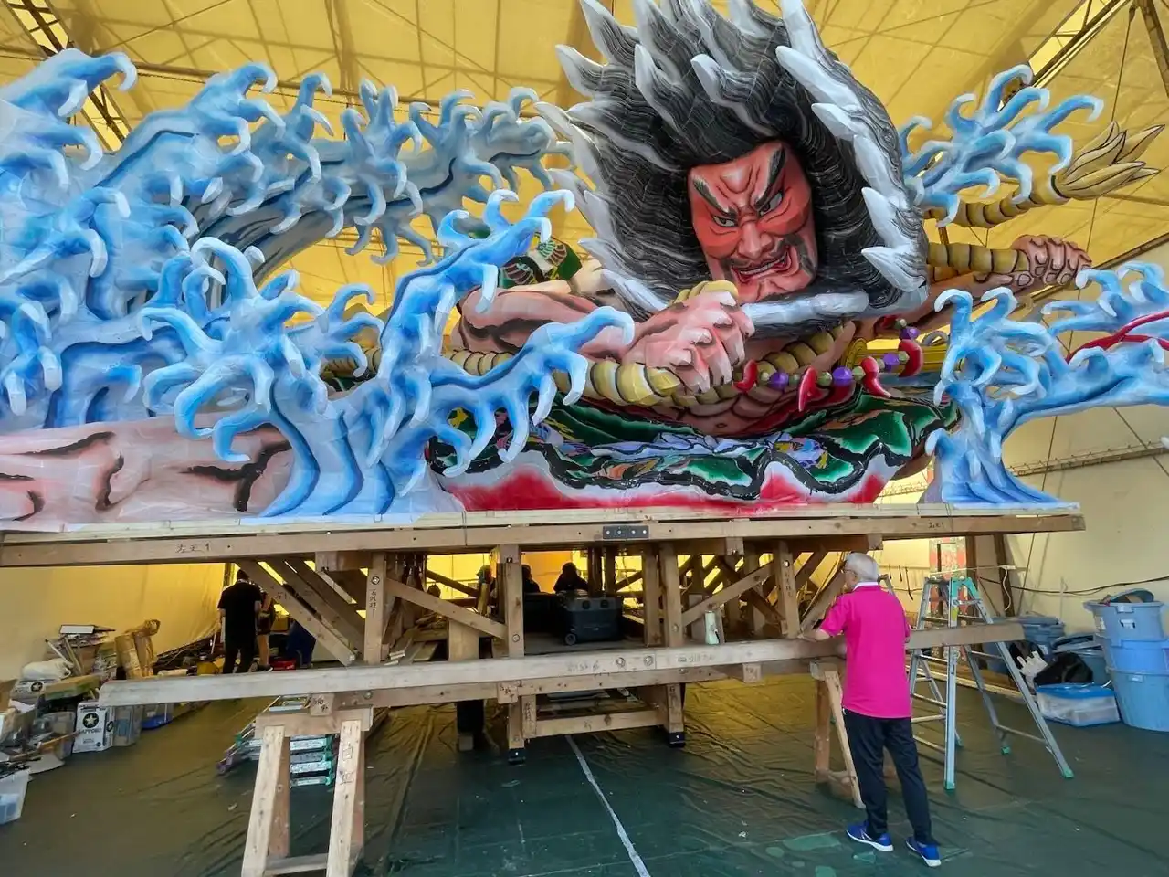 ねぶたの組み上げ段階から、ポータブル電源が設置される |
