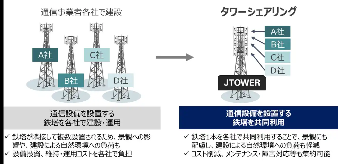 【屋外タワーシェアリングについて】 屋外タワーシェアリングとは、屋外での基地局設置用の鉄塔・コンクリート柱・ポール・アンテナなどの設備をJTOWERが保有・運用し、携帯キャリアをはじめとする通信事業者等にご活用いただくサービスです。 タワーシェアリングの活用により、通信事業者の設備投資、運用保守にかかるコストを削減できることはもちろんのこと、工事回数が減ることによる環境負荷の低減、景観への配慮にもつながります。 さらに通信インフラの保守においては、過去敷設した通信鉄塔の老朽化による補修や建て替えなどに加え、大規模災害への対応も必要とされており、携帯基地局における運用の安定性や維持コストが通信業界における大きな課題となることが予想されます。こうした中、通信事業者間での既存インフラの共同利用は今度、課題を解決する有効な手段として期待されています。 |