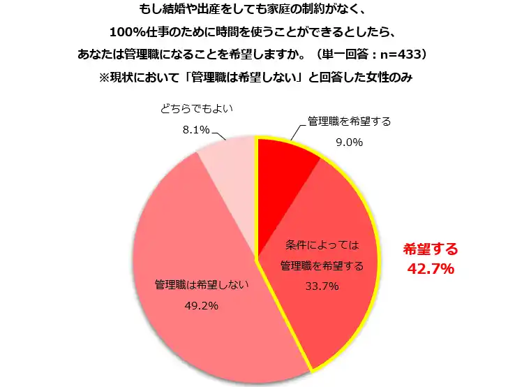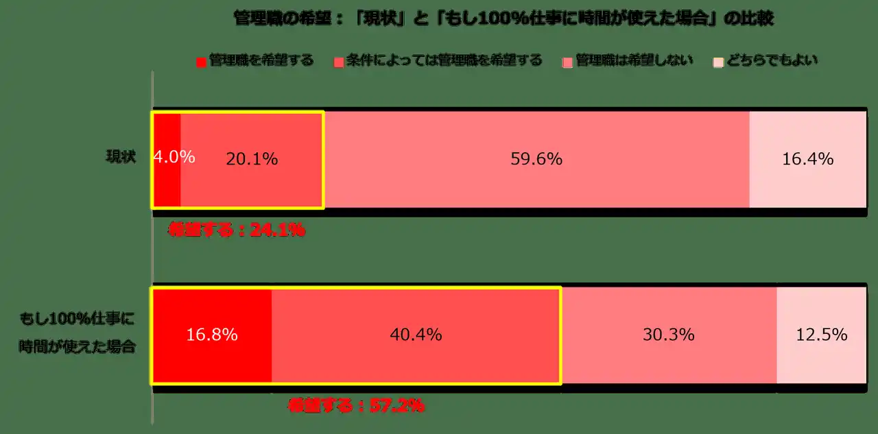 さらに、「もし結婚や出産をしても家庭の制約がなく、100%仕事のために時間を使うことができるとしたら、あなたは管理職になることを希望しますか」と尋ねたところ 「希望する」と答えた人の比率が24.1%から57.2%へと跳ね上がりました。また、現状では「希望しない」と回答した人であっても、100%仕事のために時間を使えるなら42.7%が「希望する」と答えました。家庭の時間制約がある前提で管理職になるのは負担が大きく、ブレーキがかかってしまいます。そんな“行く手に見える急な上り坂”をあらかじめ避けようとしてしまうことが、女性を管理職から遠ざけている面があるようです。女性管理職比率のさらなる上昇には、時間制約や家庭負担の偏りを取り除くことが、不可欠なのだと考えます。 |
