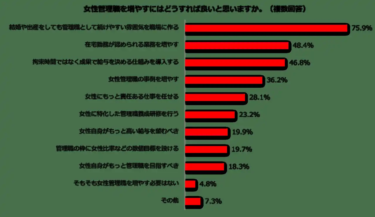 続けて「女性管理職を増やすにはどうすれば良いと思いますか」との質問には、75.9%が「結婚や出産をしても管理職として続けやすい雰囲気を職場に作る」と答えました。また4割超が「在宅勤務が認められる業務を増やす」「拘束時間ではなく成果で給与を決める仕組みを導入する」と回答しています。雰囲気・在宅勤務・成果給は、女性が管理職を務めやすくなる鍵を握っていると言えそうです。 |