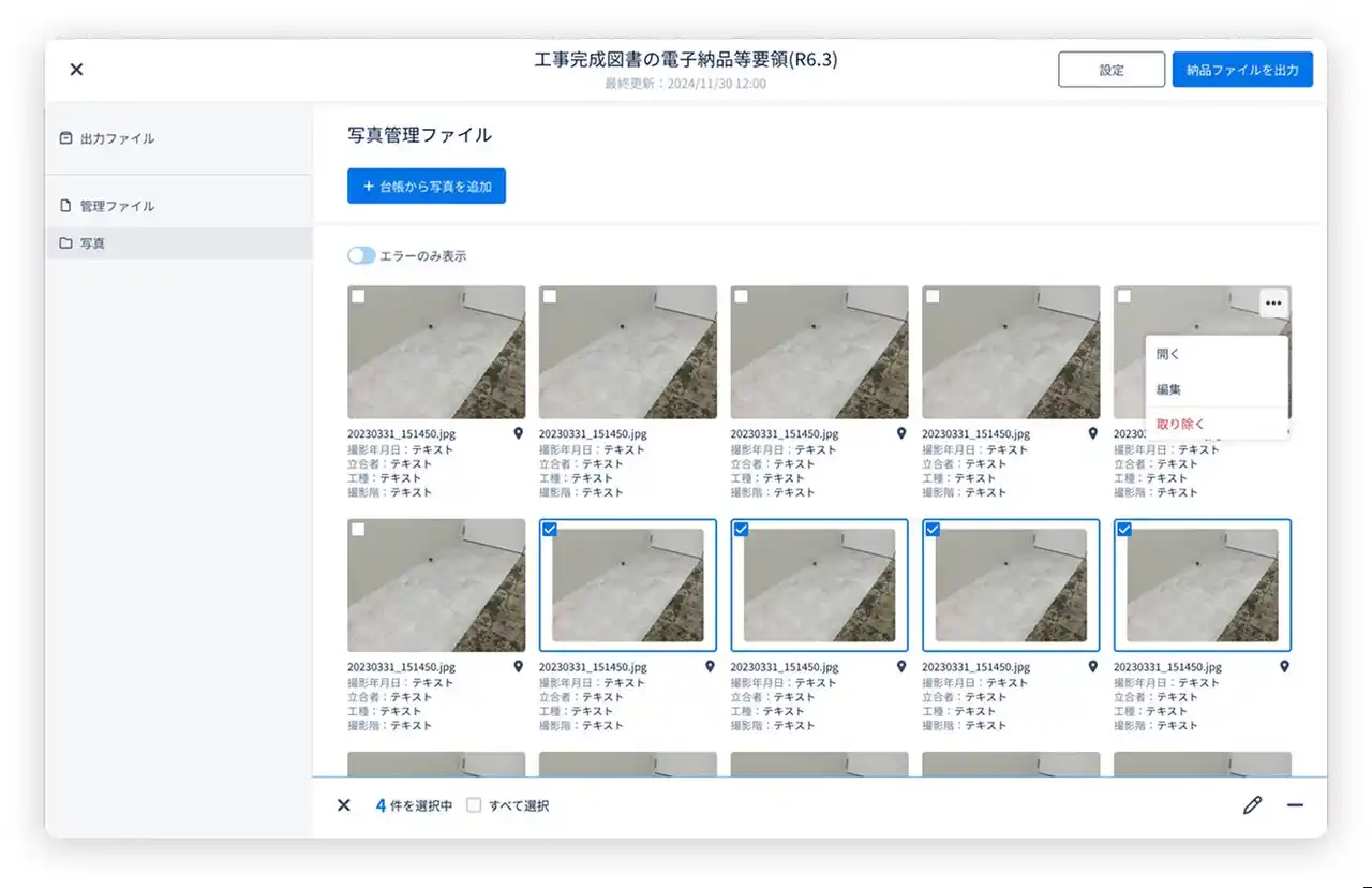 「建設の世界を限りなくスマートにする」をミッションに掲げる 株式会社フォトラクション(本社:東京都品川区、代表取締役 CEO:中島 貴春、以下「フォトラクション」)は、建設生産支援クラウド 「Photoruction」 の電子納品機能を大幅にリニューアルすることをお知らせします。今回のリニューアルは、建設業における電子納品分野で実績を持つ福井コンピュータ株式会社(本社:福井県坂井市、代表取締役 COO:杉田 直、以下「福井コンピュータ」)より技術支援を受け、新たに開発した電子納品エンジンをクラウド上に搭載することで、より多くの要項・基準に柔軟かつ迅速に対応できる体制を整えました。 |