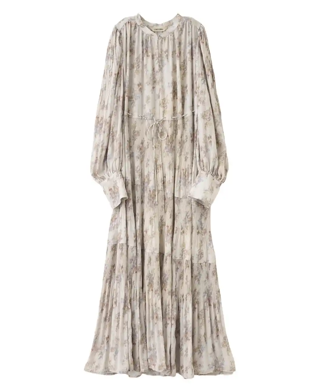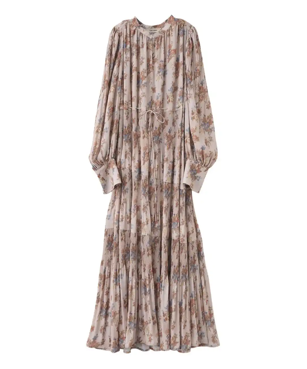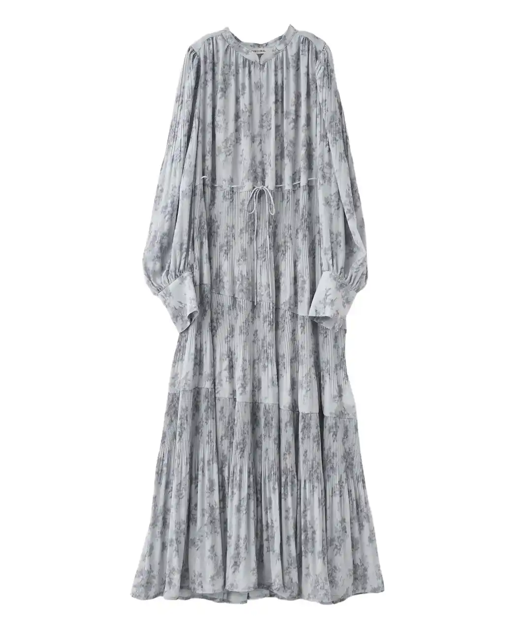 ヴィンテージライクなフラワープリントを施したワンピース。寒い時期にも着られるように透け感が程よいジョーゼット素材を使用。 プリーツをティアードデザインにすることで裾に向かって広がり、歩く度に揺れる上品な印象に。 調節可能なウエストリボンで、お好みのシルエットをお楽しみいただけます。 |