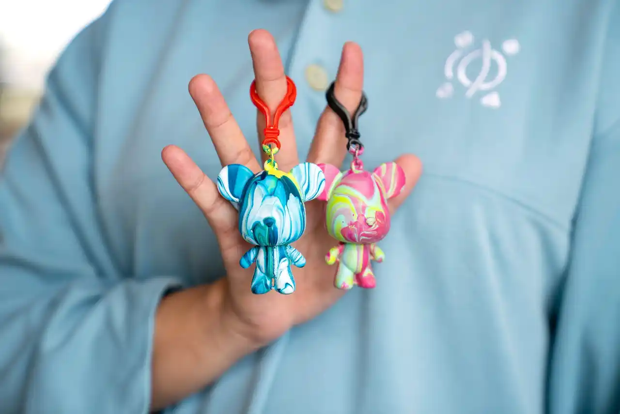 | くまのキーホルダーのポーリングアート体験を開催いたします。好きな色の絵の具を流しかけて、自分だけのオリジナルキーホルダーを作ることが出来ます。同じ色でも、絵の具のかけ方によってどんな柄になるかは完成までのお楽しみです!完成したキーホルダーは、ぜひバッグなどに付けてお使いください。 | ||||||||||||||