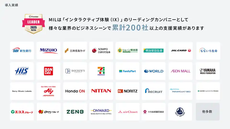 MILは2018年の設立以来、「インタラクティブ体験」のリーディングカンパニーとして、お客様のビジネス成果に貢献してきました 。インタラクティブコンテンツ制作配信プラットフォーム「MIL」を中核に、単なるツール提供に留まらず、マーケティングから採用までお客様の業務プロセスを「成果の出る体験」へと変革します。お客様が「作って終わり」のコンテンツ量産から脱却し、データに基づいた再現性の高い成果創出のサイクルを自社で回せるよう、戦略設計から実装、分析、伴走支援までプロフェッショナルチームが徹底的に行います 。 |