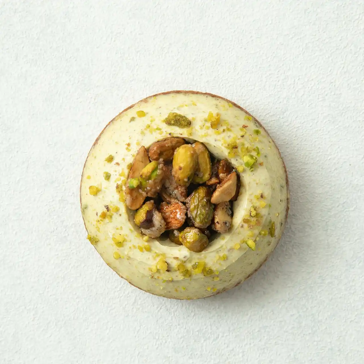 クレームダマンドもデコレーションも濃厚なピスタチオの味わいでリッチに。中に仕込んだコーヒークリームとの相性も抜群です。 |