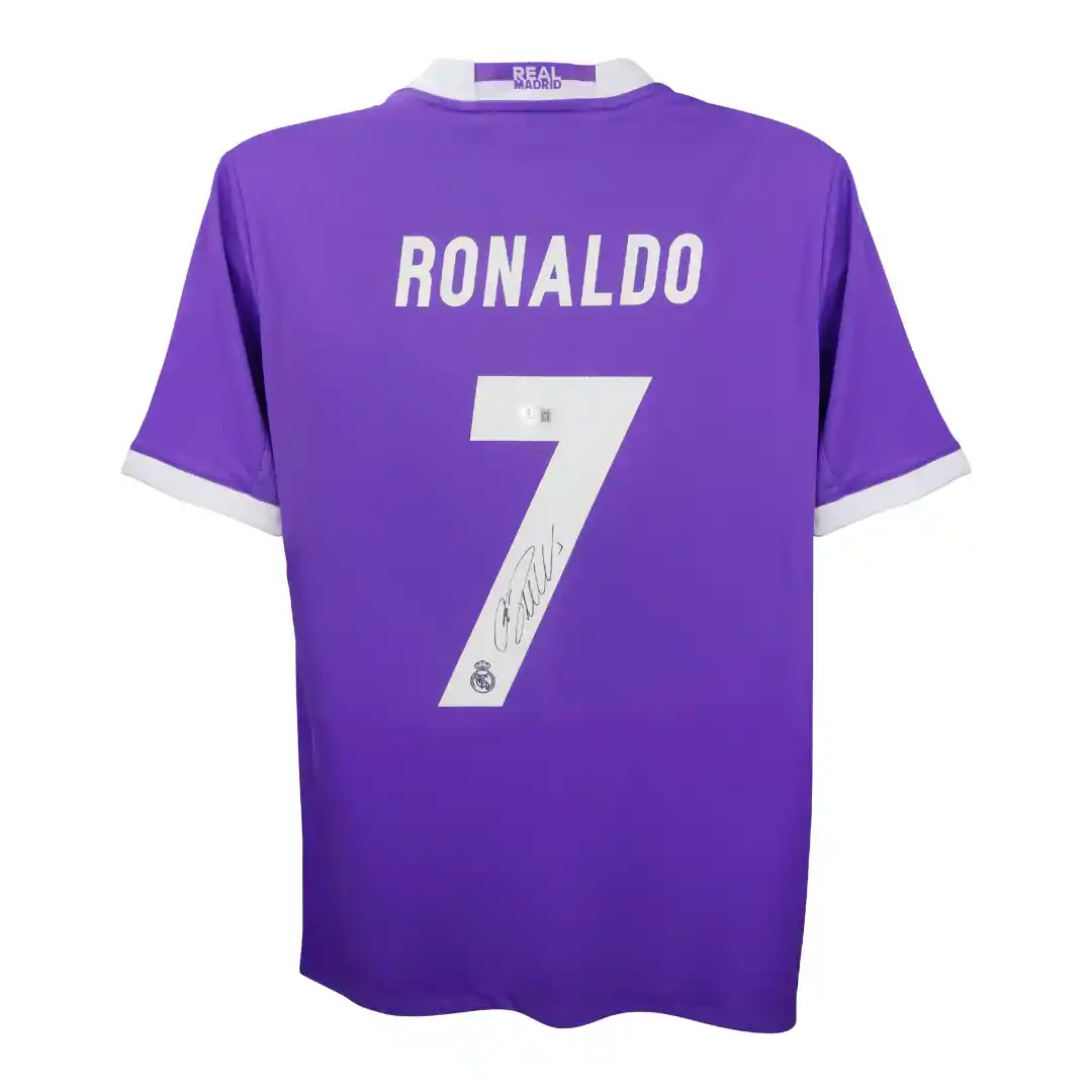 そして、世界中で「史上最も偉大なサッカー選手の一人」と称されるクリスティアーノ・ロナウド選手の、直筆サイン入りユニフォームも展示・販売いたします。多くのファンにとって憧れの存在であるロナウド選手のサインアイテムは、それだけで非常に高い希少価値を誇りますが、今回ご紹介するのは、その中でもさらに希少な「紫基調カラー」のユニフォームモデル。一般流通数も少なく、コレクター市場でも特に注目される一着となっています。 |