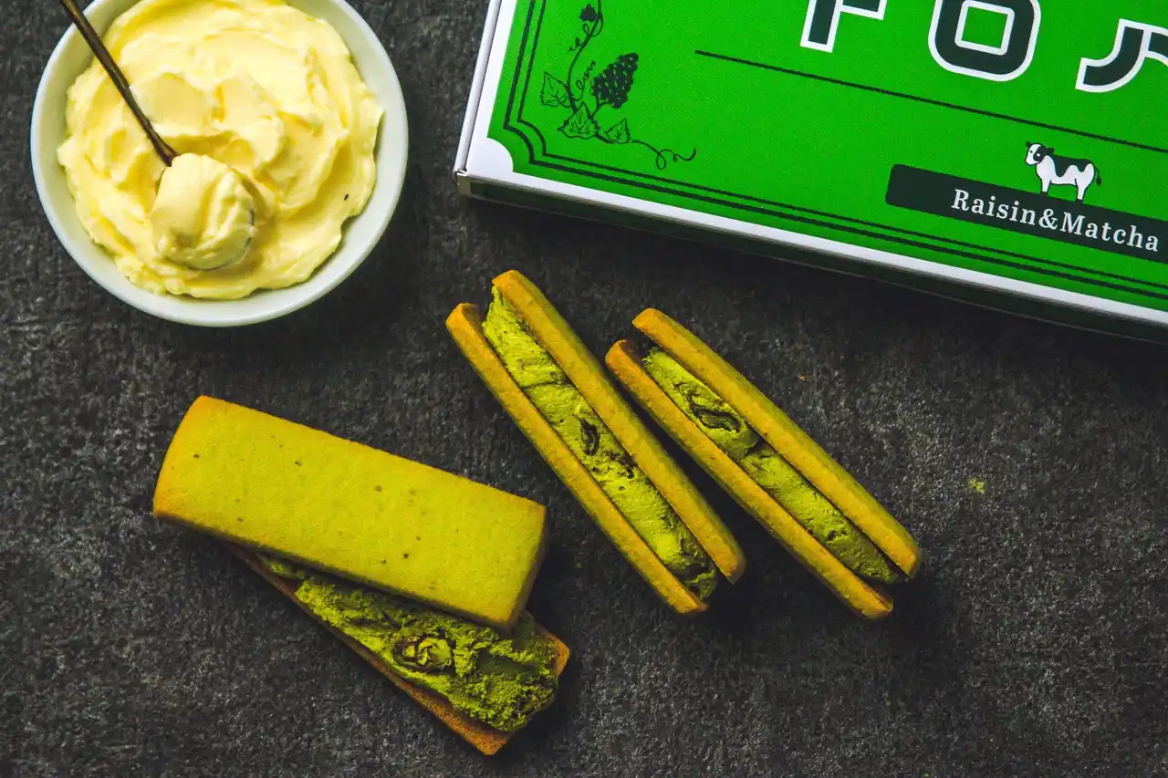 | ミルクリッチでジューシーなラム漬けレーズン入りの抹茶クリームを発酵バターたっぷりの抹茶香るクッキーで挟んでいます。 | |||||