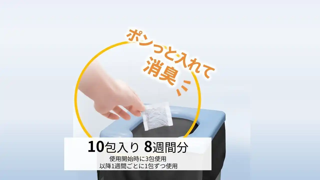 本製品の最大の特長は、「入れるだけ」で簡単消臭が可能な点です。また、初回は3包、その後は1週間に1~2包を便槽に投入するだけで、継続的に効果を発揮します。 |