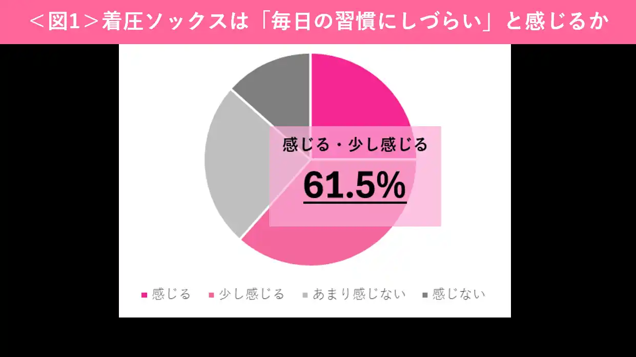 実際に、日頃のボディケアとして着圧ソックスを着用している女性のうち61.5%が、着圧ソックスを「毎日の習慣にしづらい」と感じていることが分かりました<図1>。「金曜日のリセットリフレ」は、このような着圧ユーザーの声に寄り添い、よりラクに自分のケアをしていただける商品を目指しました。 |