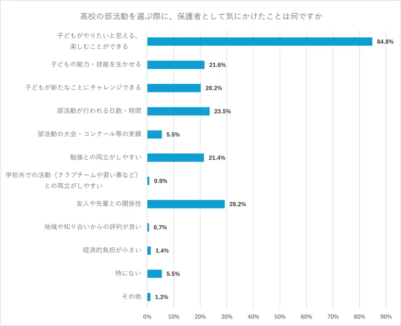子どもが部活動を選ぶ際に、保護者として気にかけたことを聞いた。最も多かったのは「子どもがやりたいと思える、楽しむことができる」で84.8%にのぼった。次いで「友人や先輩との関係性」が29.2%だった。 |