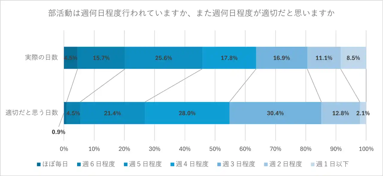 実際の活動日数をみると、最も多いのは「週5日程度」で25.6%、次いで「週4日程度」で17.8%、「週3日程度」が16.9%だった。適切だと思う活動日数は、「週3日程度」が30.4%、「週4日程度」が28.0%、「週5日程度」が21.4%と、実際の活動日数よりも少ない日数が適切だと考えている傾向があることがわかった。 |