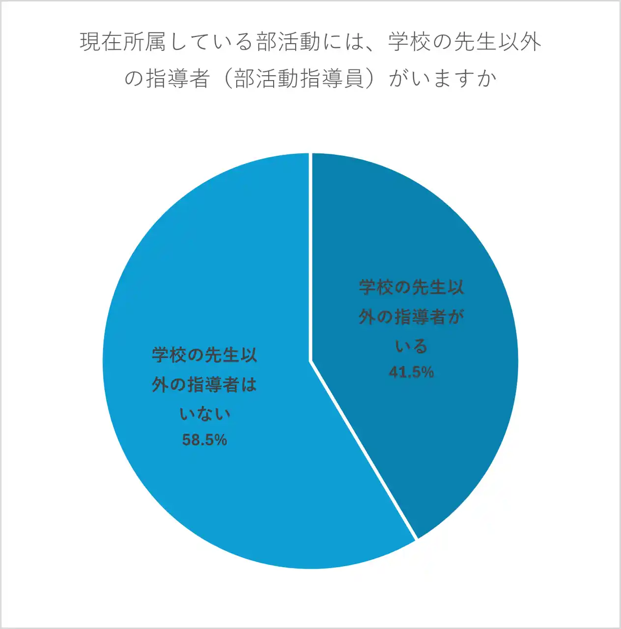 現在子どもが所属している部活動に、学校の先生以外の外部のコーチや部活動指導員がいるかを聞いたところ、「学校の先生以外の指導員がいる」は41.5%、「学校の先生以外の指導員はいない」は58.5%だった。 |
