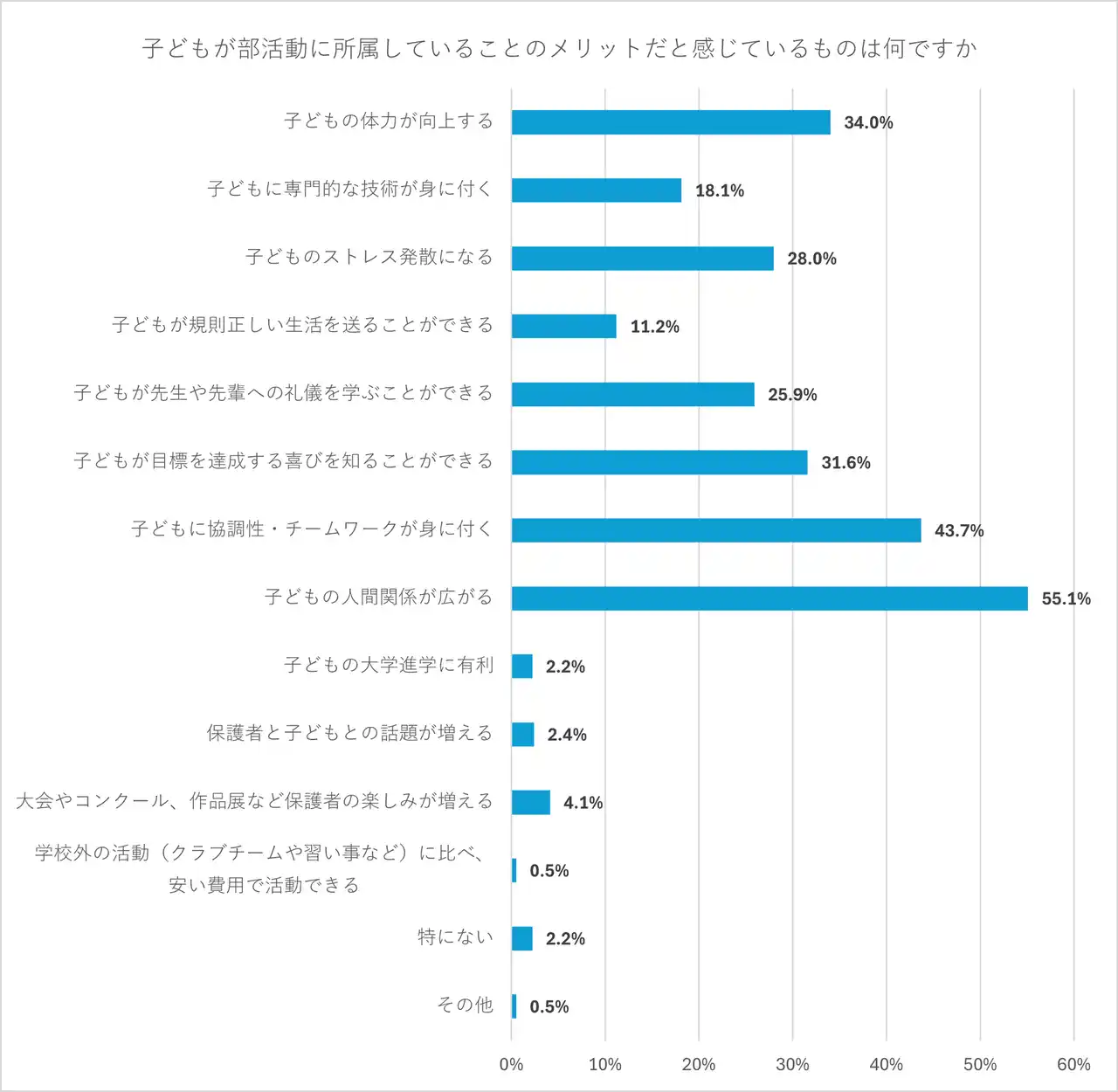 「子どもの人間関係が広がる」が最も多く55.1%、次いで「子どもに協調性・チームワークが身に付く」が43.7%だった。また、「子どもの体力が向上する」「子どもが目標を達成する喜びを知ることができる」も、3割以上の保護者が、部活動に所属していることのメリットだと回答した。 |