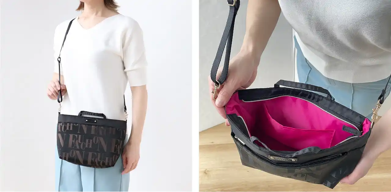 両手を自由に使いたいシーンに便利なショルダーバッグ。ベルトを外せば、Bag in Bagとしても |