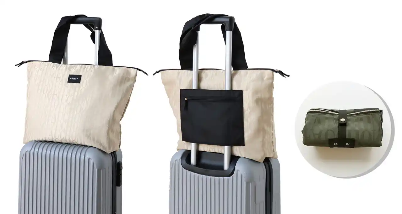 背面のポケットをスーツケースの持ち手に掛け、安定してご使用いただけるトートバッグです。 |