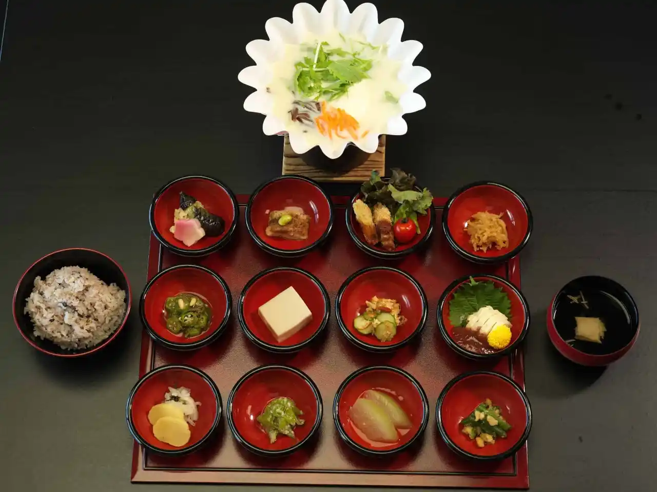 日本由来の「マイコプロテイン」(米を原料とし発酵技術を使った新しい代替肉)を活用し、動物性材料を使わない精進料理を現代的に再解釈。延暦寺本堂根本中堂のご本尊、薬師瑠璃光如来とその眷属の日光・月光菩薩、十二神将を料理の器を用いて体現した延暦寺会館で提供している「薬師御膳」を基盤に、新たに開発したマイコプロテインの小鉢料理を加えた特別な精進料理をご提供いたします。 |