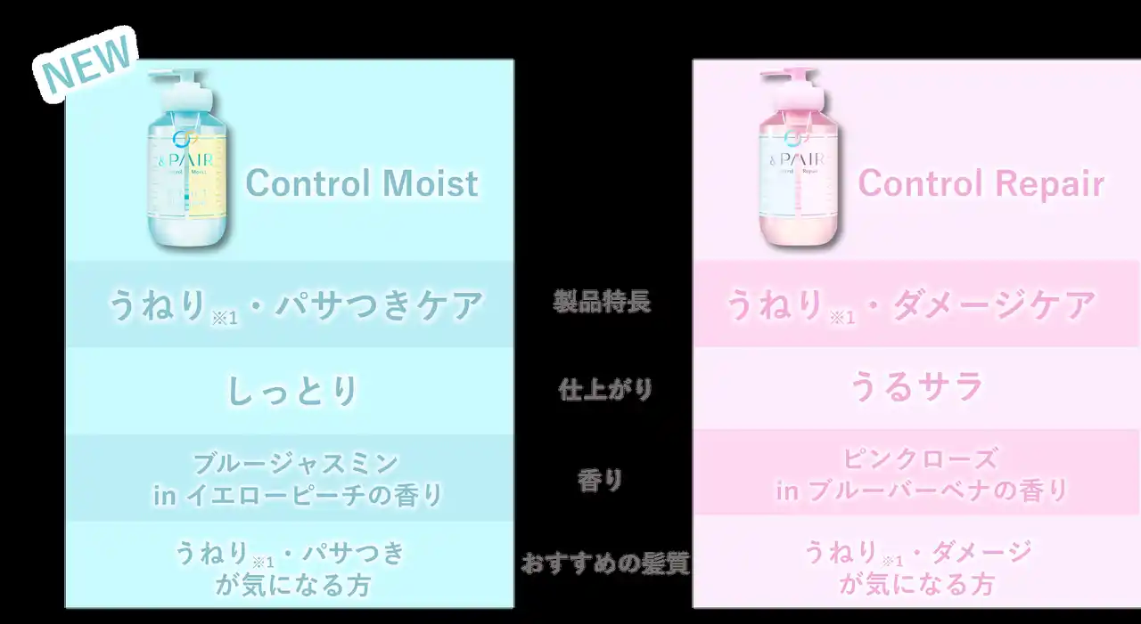 リペア」は軽めの仕上がりのため、本シリーズでは乾燥によってパサついた髪がうるおってまとまるよう、しっとりとした仕上がりを採用いたしました。既存シリーズ「コントロール リペア」はツヤのあるうるサラな髪へ、新シリーズ「コントロール モイスト」はうるおいのあるしっとり髪へ導きます。髪質やお好みの仕上がりに合わせてお選びいただけます。 |