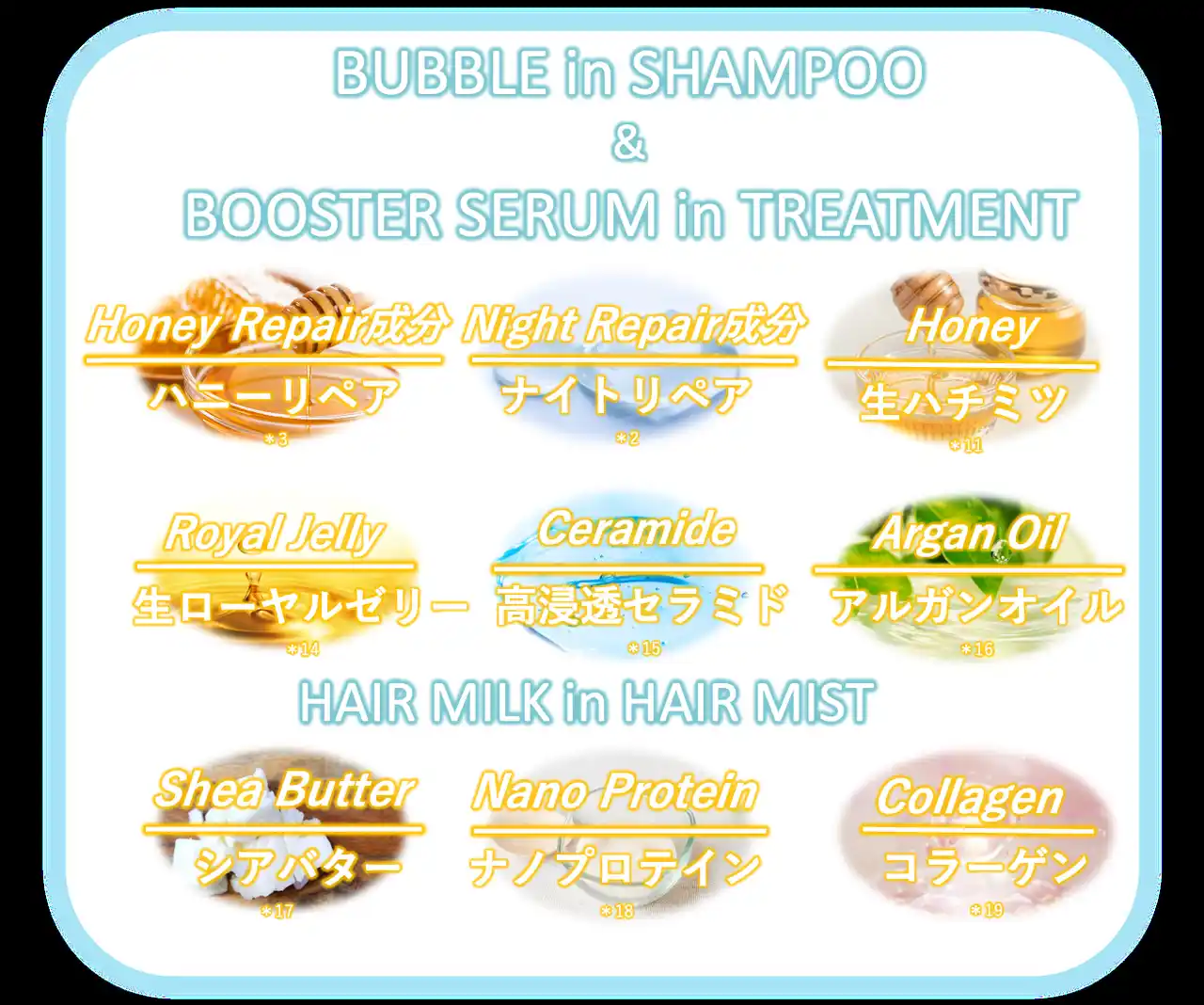 *2 月見草油、加水分解ケラチン(保湿・補修)(シャンプー、ヘアトリートメントのみ配合)*3 ハチミツ(保湿)、加水分解ハチミツタンパク(保湿・補修)*10 保湿 *11 ハチミツ(保湿・加熱処理していない)*13 γードコサラクトン(補修)*14 ローヤルゼリー(保湿・加熱処理していない)*15 スフィンゴ糖脂質(補修) |