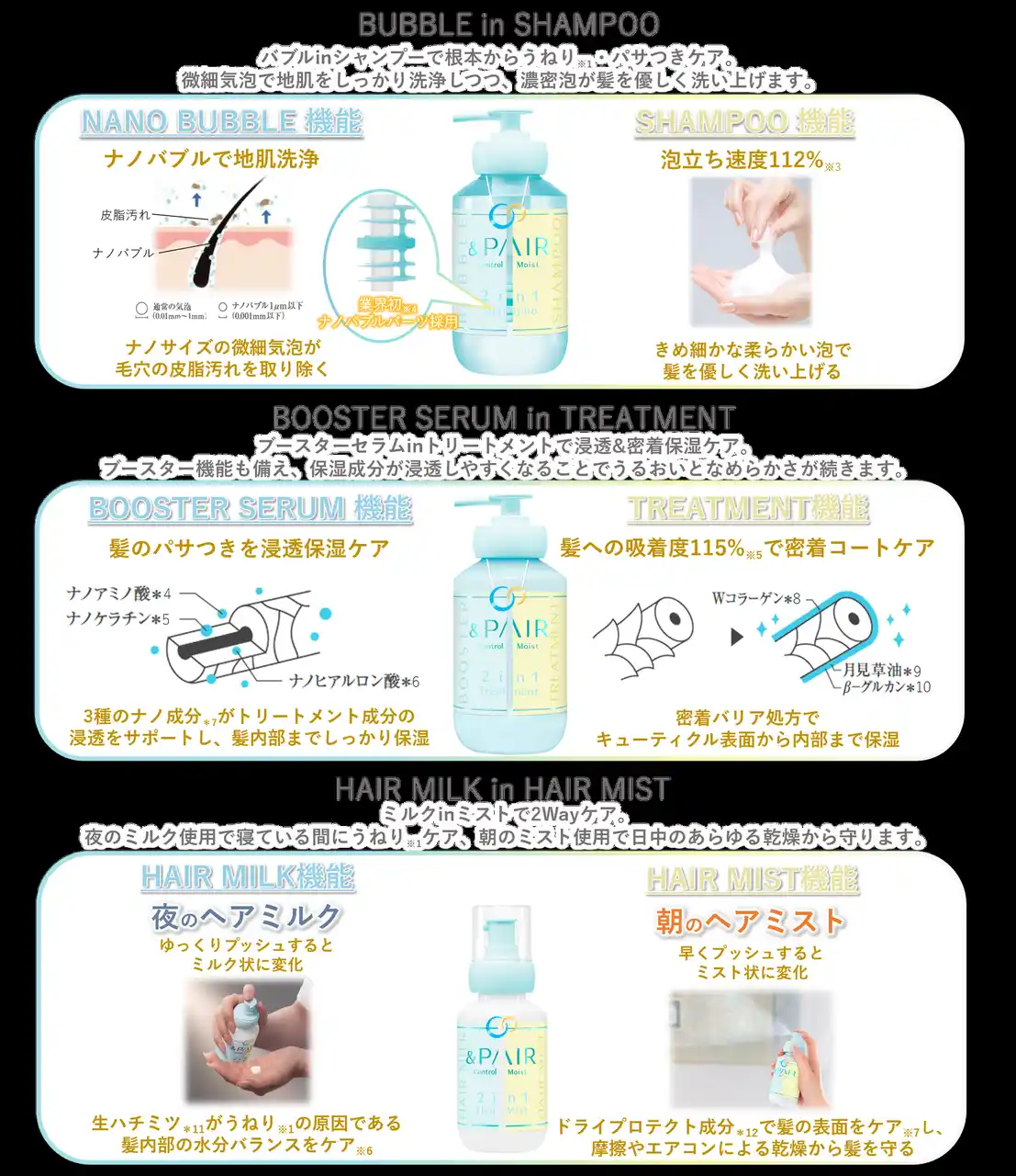 ※1 乾燥により髪のしなやかさが不足し、まとまりにくい状態 ※3 泡量が一定体積に到達するまでの時間のこと(当社既存品比(&H シャンプーMM比))、髪質・泡立て方などにより個人差があります ※4 新型ナノバブルパーツ採用のヘアケア製品(当社調べ(2024年11月時点)、アンドペアブランドとして)※5 一定時間での吸着量のこと(当社既存品比(&H ヘアトリートメントMM比))、髪質により個人差があります ※6 補修による ※7 皮膜による保護のこと |